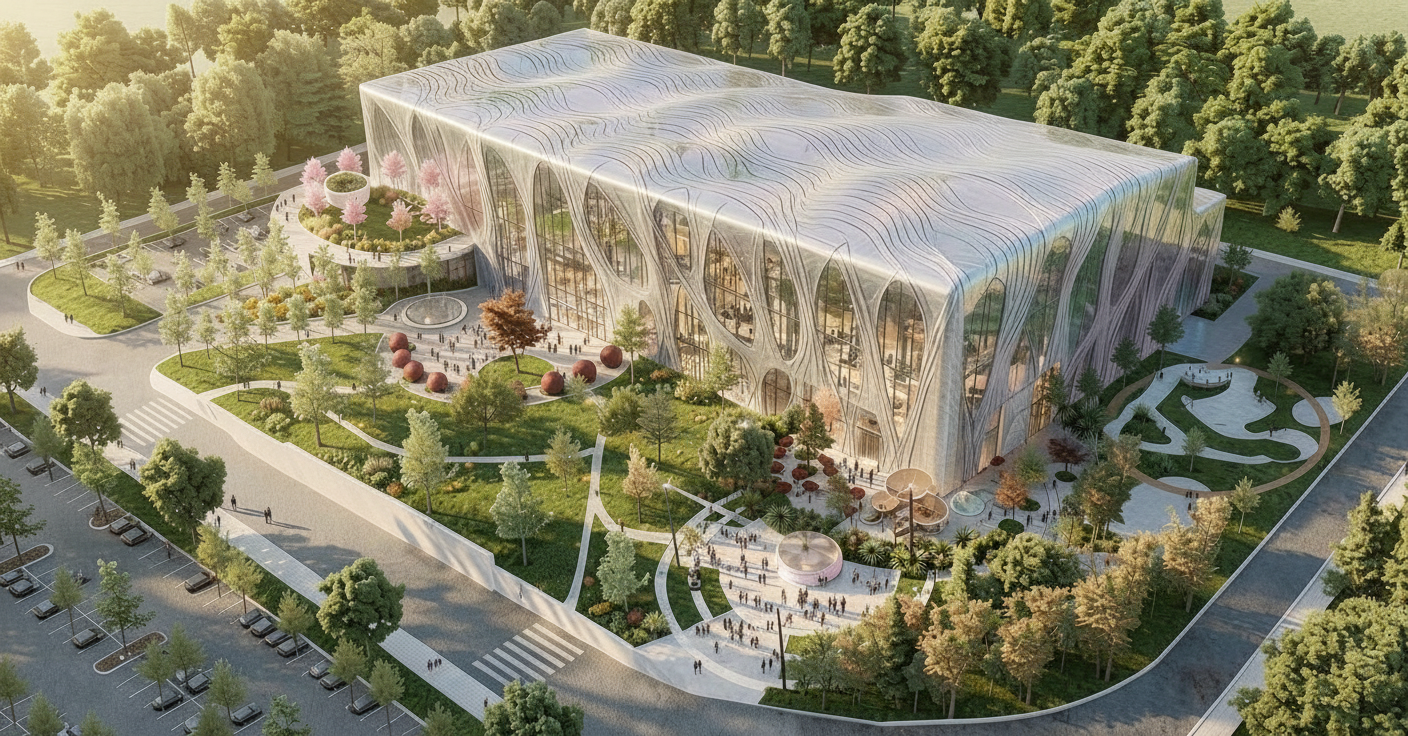 retain everything the style and lighting and render style just add the logo wave on the front of the building that matches the style of the building