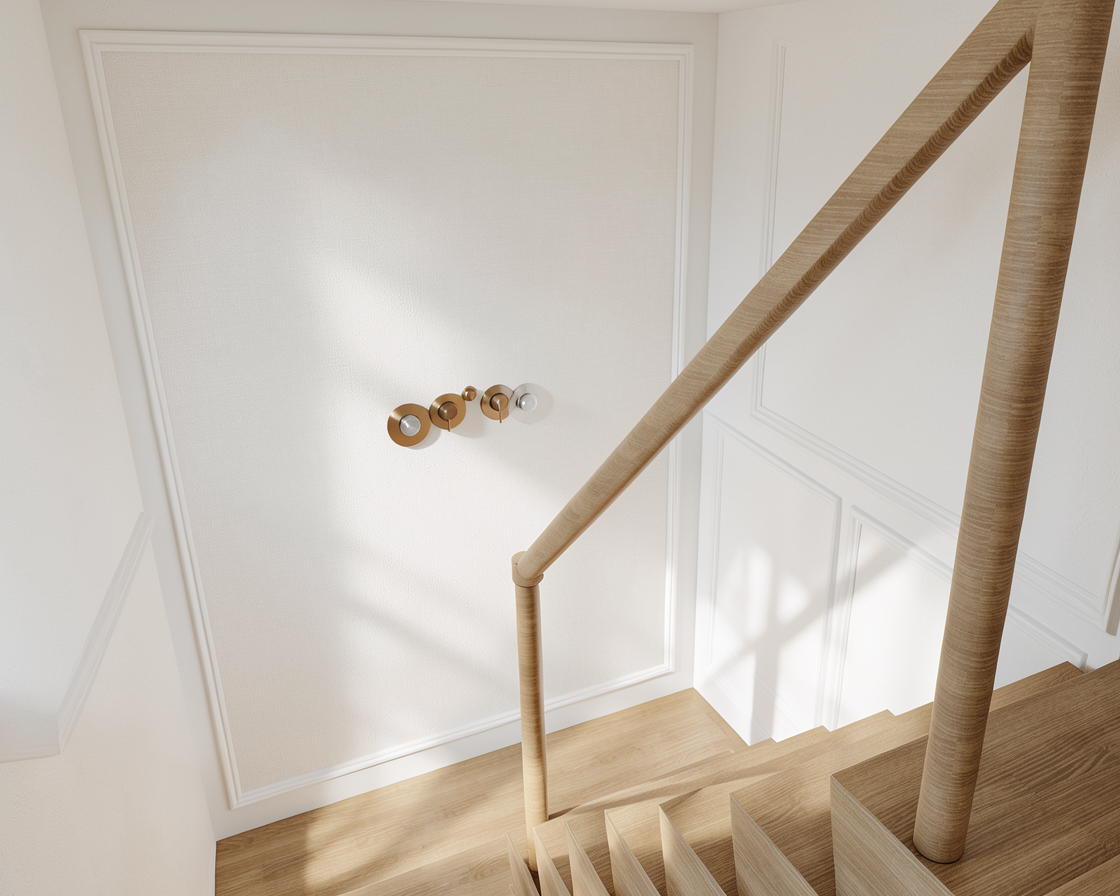 make as photorealistic as possible while keeping textures the same as selection professional landscaping in a lightly wooded scene with good lighting off white stucco dark red antique brick dark roof