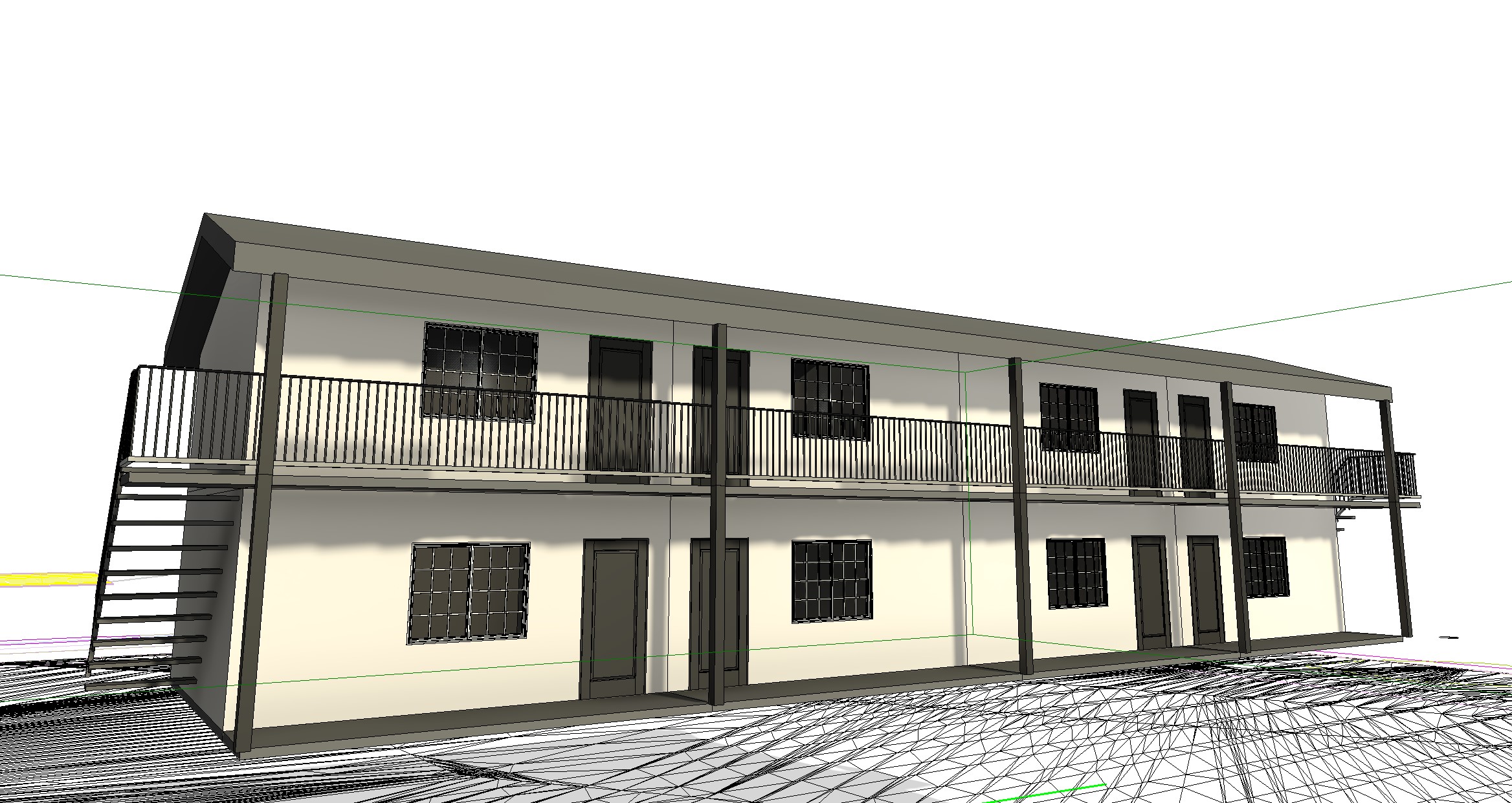 contemporary exterior shot render image showing asphalt paving at front and trees in the back of the building with contemporary brown stucco and black steel posts and railings add a house on the far right side and also on the rear background with trees architecture