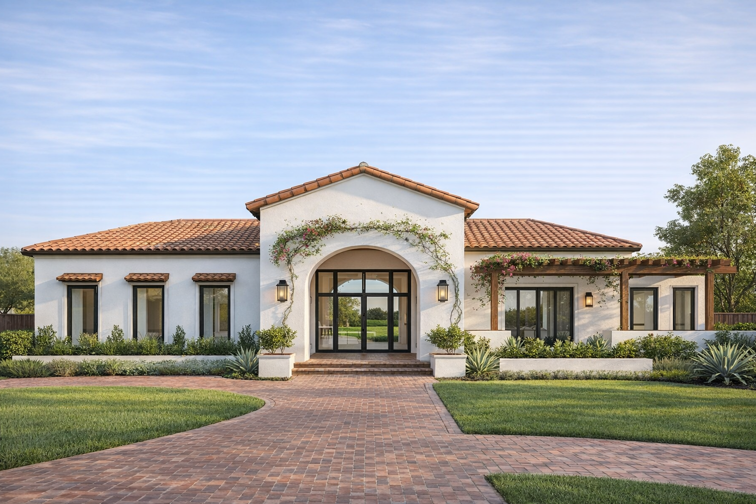 add courtyard with modern fountain in front door and stucco walls to close in the courtyard