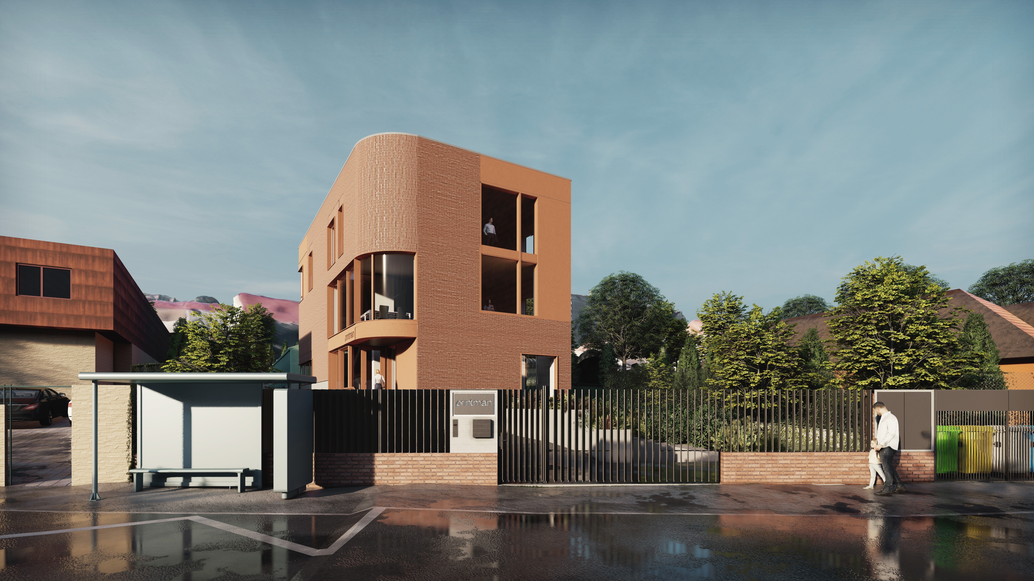 match the atmosphere and color grading of a soft golden hour architectural visualization warm low angle sunlight with gentle elongated shadows but kept subtle and natural no dramatic sunset look sky is pale warm blue with a slight peach tint near the horizon clean and calm lighting is warm and flattering on fa ades with soft contrast smooth tonal transitions and controlled highlights no clipping mild atmospheric depth and realistic global illumination color palette warm golden highlights on concrete stone natural greens soft warm neutrals and slightly cooler shadow tones for balance photoreal modern archviz look cinematic but restrained important keep the existing geometry camera framing landscaping surrounding buildings and overall context exactly the same do not add or remove elements material edit only replace all red brick on the fa ade with anthracite grey brick dark charcoal grey keep the brick pattern scale roughness grout joints and texture characteristics the same change only the brick color tint with subtle natural variation critical do not change the color tint of the window frames mullions glazing or any joinery frames t mpl rii preserve their current color exactly add interior lighting turn on warm interior lights visible through windows 2700 3000k subtle and realistic with varied intensity per unit not all windows equally lit no blown out white rectangles