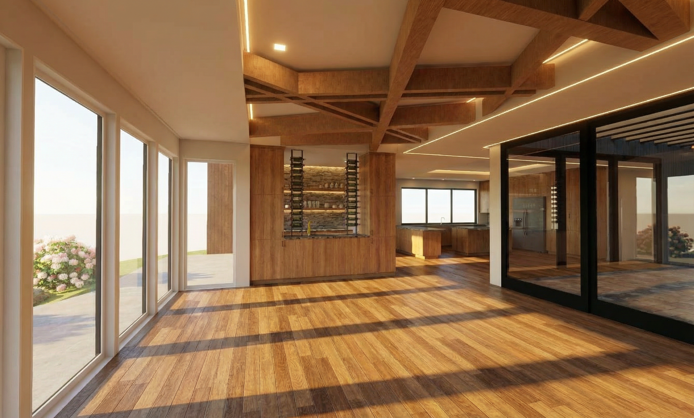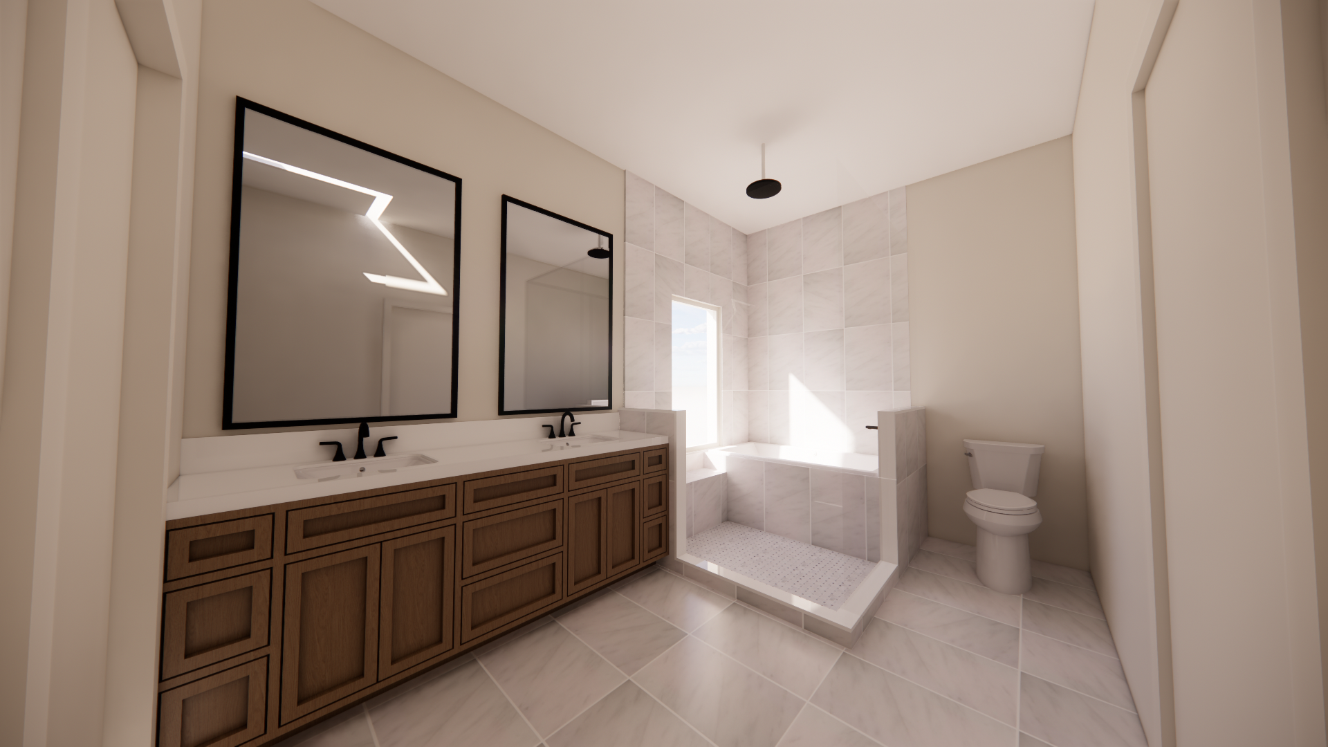 create a high end residential bathroom rendering maintain the exact layout proportions and all architectural elements as provided do not modify the design materials finishes walls painted in sherwin williams origami white with a smooth matte finish flooring and shower walls in 12x24 carrara marble tile soft white with subtle gray veining laid in a clean modern pattern grout lines tight and minimal for a refined look matte black plumbing fixtures throughout faucets shower trim hardware modern and minimal in design tub shower condition the bathtub is a drop in tub located within the shower enclosure tub deck is flush and clean lined tub front clad in matching carrara marble for a seamless integrated look maintain a monolithic appearance with continuous stone detailing lighting soft natural daylight entering from one side warm diffused ambient lighting with no harsh shadows subtle realistic reflections on fixtures and tile style atmosphere bright clean and minimal aesthetic slightly warm tone to balance the white palette no additional decor or styling beyond what is shown realism enhancements improve material texture accuracy stone veining matte paint metal finishes add soft shadowing and realistic depth ensure correct scale and crisp edges maintain true to life reflections and lighting behavior important constraints do not change layout materials or color palette do not add new elements or redesign any features only enhance realism and clarity of the existing image