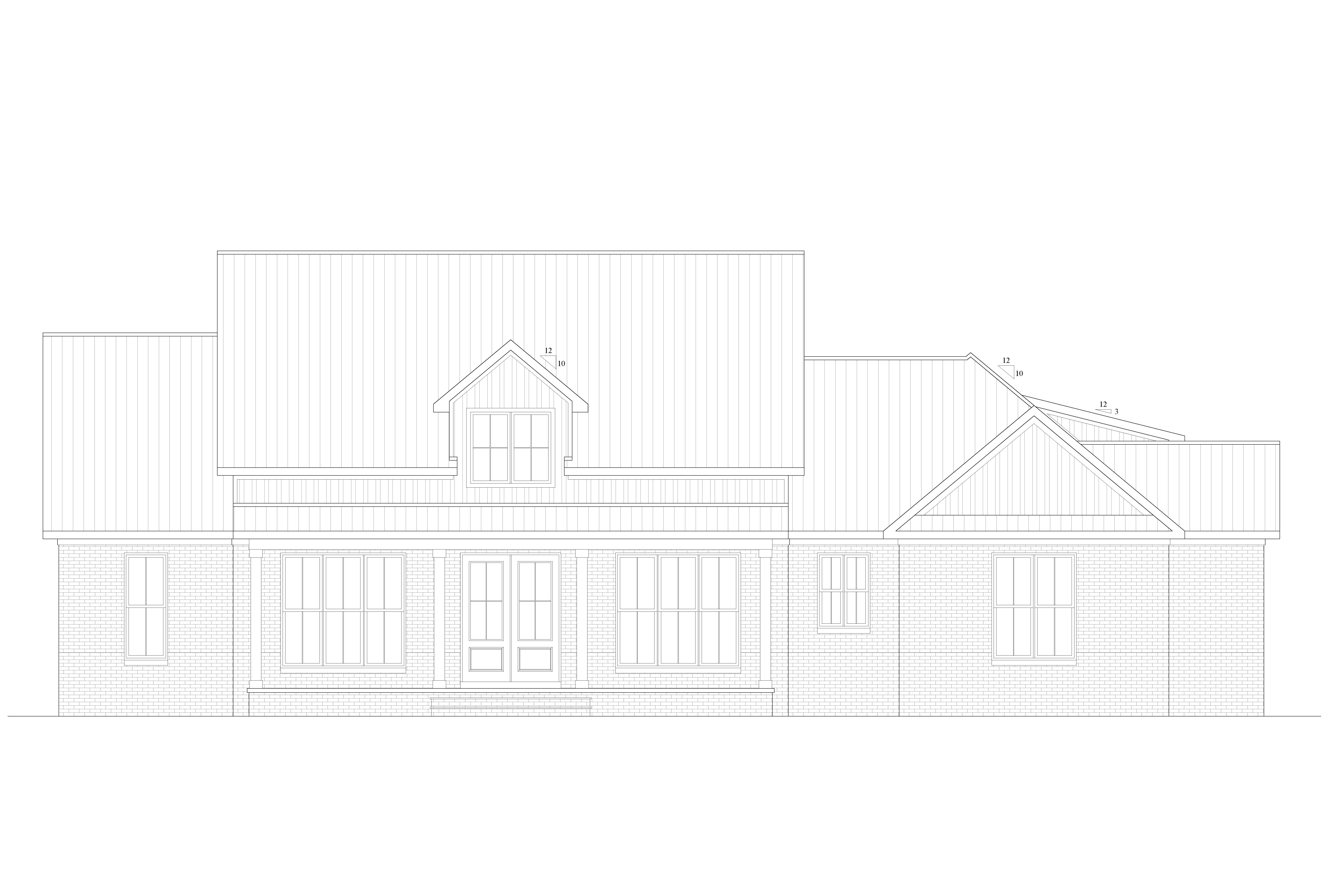 dark grey brick iron ore board and batt siding black windows black trim black metal roof wooded land make realistic
