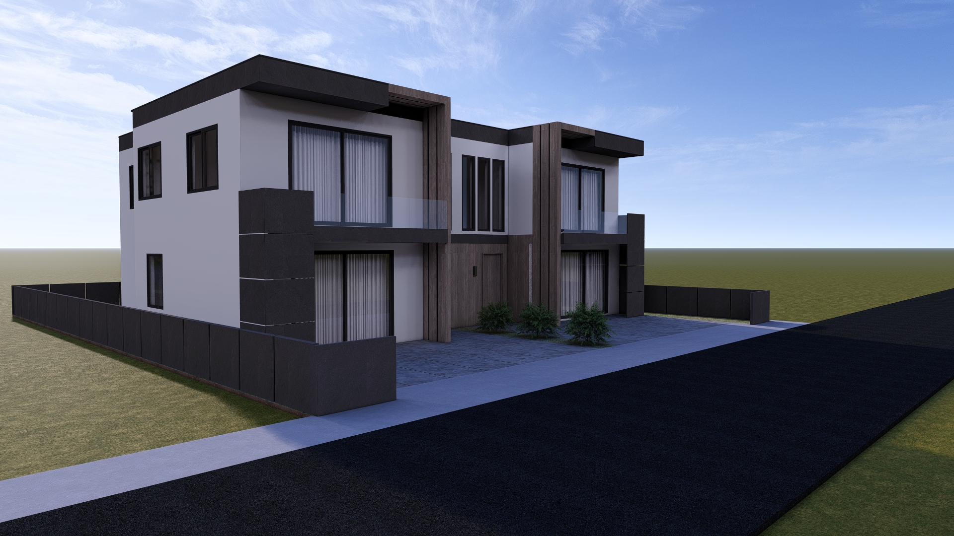 modern duplex house exterior in a real neighborhood daytime realistic lighting and proportions existing materials unchanged