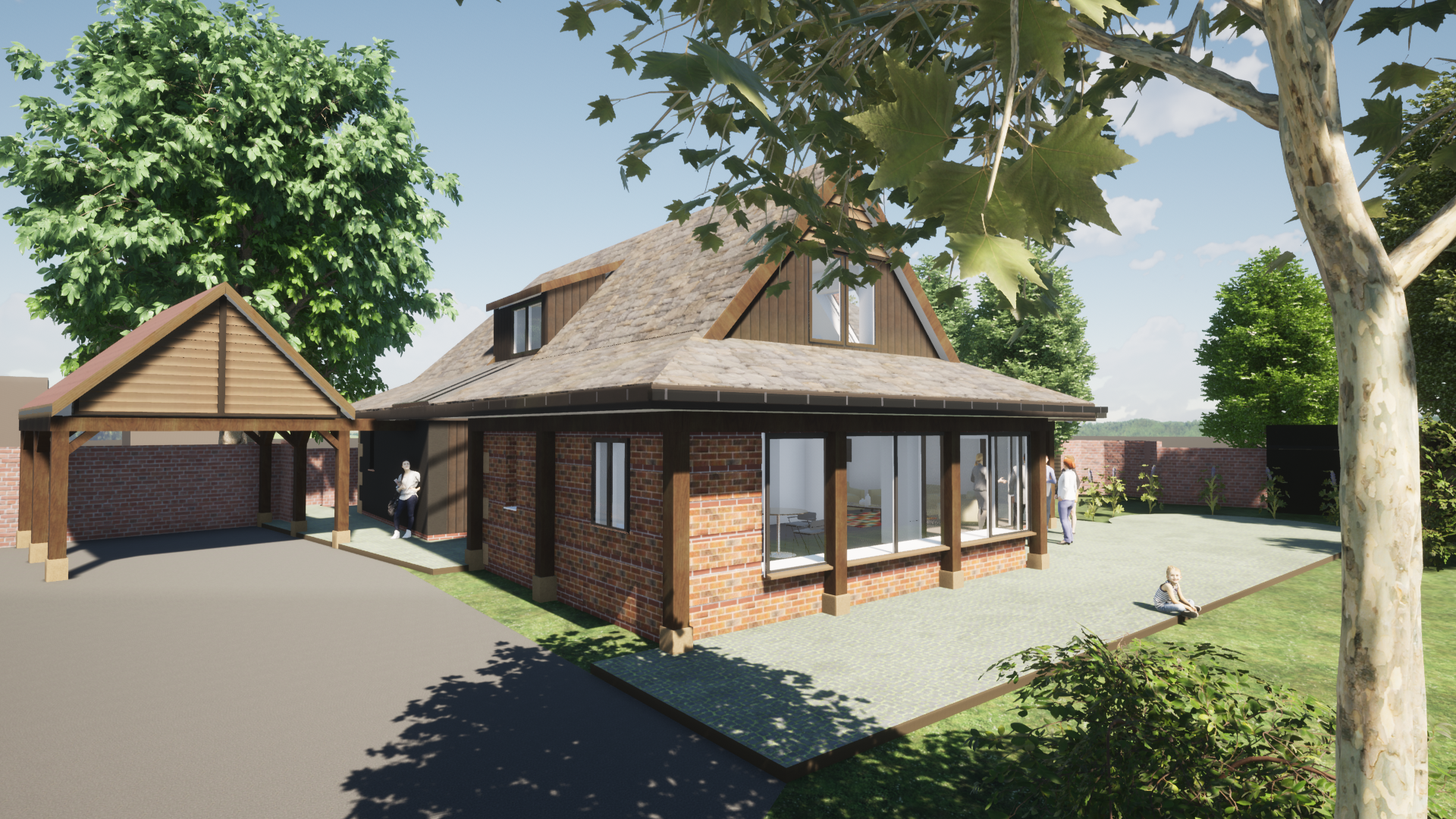 render a modern building with a welcoming serene atmosphere the lower walls are banded with old and new red brick and upper dormers of natural dark brown wood sidings the house and carport have large oak posts on stone bases use a soft cloudy sky to diffuse sunlight gently in the garden lush green lawn and shrubs the pathway is a textured cobbled light gray contrasting with the green lawn a large leafy green tree provides partial shade enhancing the tranquil ambiance