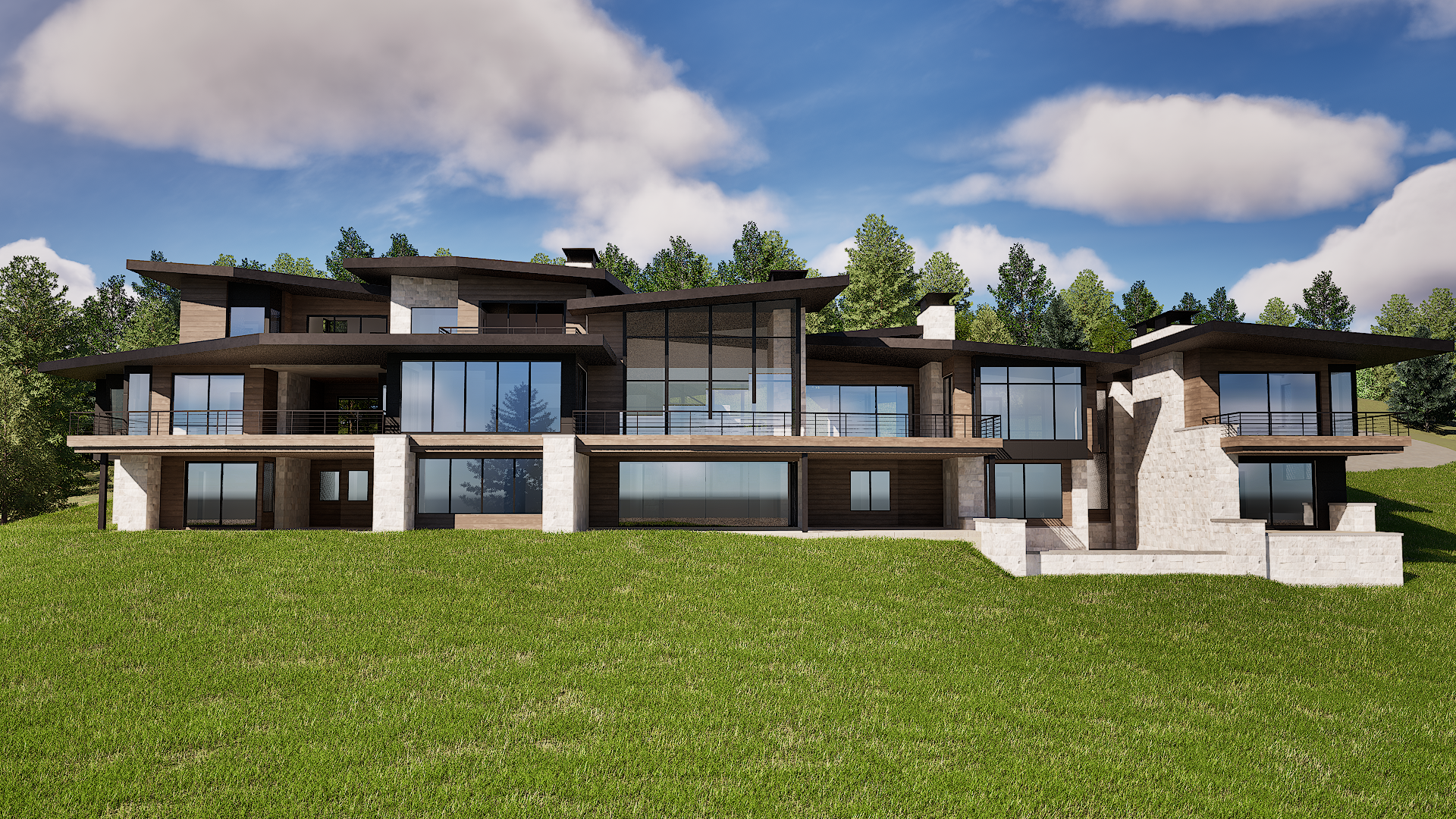 don t change the structure a modern home made from the following materials white stacked stone veneer dull black aluminum acm metal paneling horizontal brown wood siding and a black aluminum metal fascia enhance each of these materials to have more realistic shadows and textures add a dull warm light illuminating from the interior add landscaping and vegetation around the exterior of the home with green bushes tall grass and flower bushes enhance the trees in the background to look more realistic enhance the lawn grass to have a clean cut around the driveway and look more realistic add furniture on the interior and add a little patio furniture and decor