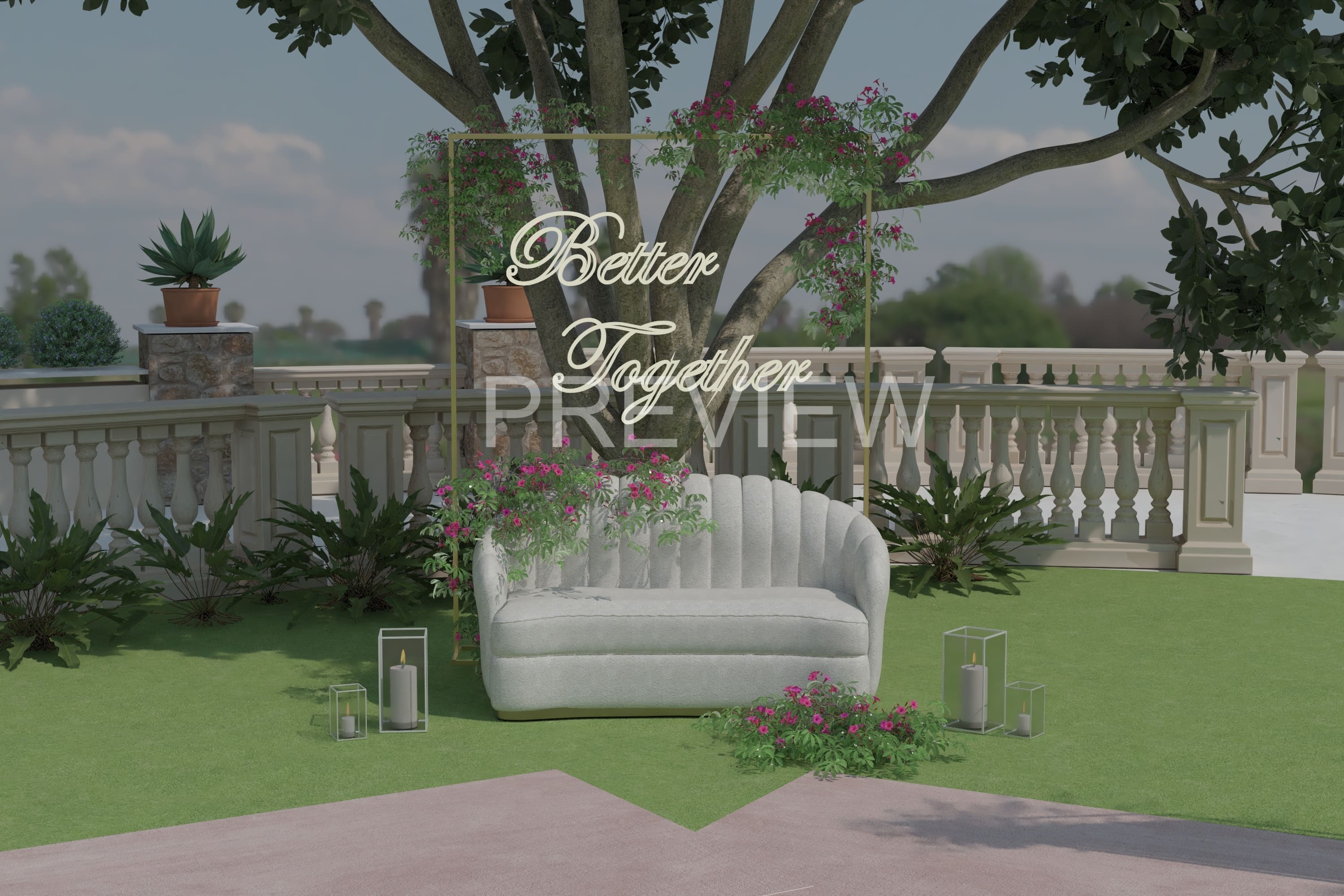 want wedding style moodboard not architecture remove the tiles and wood and replace with bougeinvillea flowers and yellow roses add the sign better together and the names antonis danai add some fairy lights