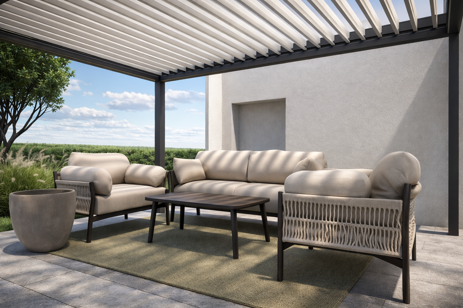 render a serene outdoor patio scene with a modern pergola the pergola beams are crisp white casting soft shadows on the ground a comfortable outdoor sofa set with plush beige cushions and dark wooden frames is centered the coffee table has a sleek dark wood finish add a large beige plant pot to the side the patio floor is a smooth gray stone complementing the neutral tones a woven green rug sits under the furniture providing a pop of subtle color surround the patio with lush green grass and a bright blue sky with fluffy white clouds creating a calm and inviting atmosphere