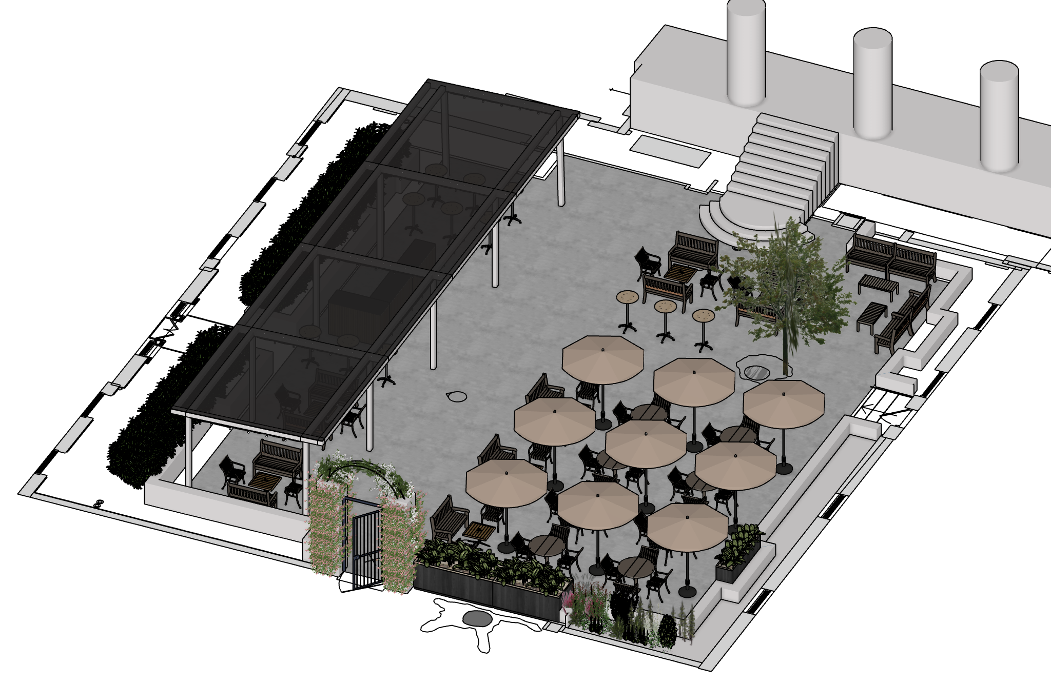 photorealistic isometric aerial render of an elegant london hotel courtyard event space georgian brick building facade with tall white columns and arched windows surrounds the courtyard on multiple sides large black glazed canopy pergola structure with white posts on the left side multiple large natural tan parasols with bistro tables and dark timber chairs arranged across a grey stone paved courtyard tall mature leafy tree in the centre lush green hedging and flowering planters along the boundaries decorative floral arch gateway at the entrance curved stone steps leading up to the building entrance large cylindrical stone columns flanking the building raised dark timber planter beds filled with flowers and greenery along the perimeter wooden bench seating along the walls warm golden summer daylight isometric overhead perspective