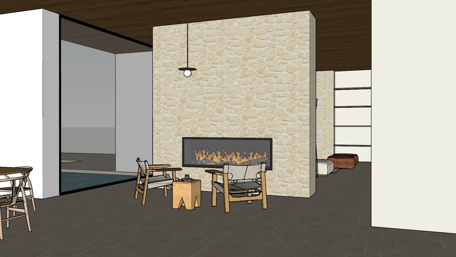 photorealistic architectural render of a modern mediterranean villa interior in croatia using the exact layout camera angle furniture and object distribution from the reference image strict constraints do not change layout proportions or camera position do not change furniture design number scale or placement do not add or remove objects preserve the exact spatial composition material style reference match quality of second image warm high end mediterranean materials textured limestone travertine stone walls with natural imperfections rich wooden ceiling with linear slats deep warm tones soft beige linen upholstery with subtle fabric texture natural oak wood furniture with refined grain large format matte stone flooring layered realistic materials with micro details imperfections and subtle roughness variation lighting critical soft golden hour sunlight entering from the side warm indirect ambient lighting subtle integrated architectural lighting cove recessed realistic fire glow from fireplace with soft flicker and light bounce physically accurate global illumination and soft shadows atmosphere calm luxurious coastal croatian villa slight haze and natural light diffusion balanced warm color grading no overexposure render quality ultra realistic 8k ray tracing global illumination high dynamic range cinematic but natural accurate reflections and soft shadow transitions camera eye level perspective 35mm lens match original framing exactly no distortion no reinterpretation instruction emphasis use the first image for geometry and composition and the second image strictly as a material lighting and rendering quality reference negative prompt very important here different layout altered furniture new objects missing objects redesigned interior changed proportions stylized cgi look low detail harsh lighting overexposed unrealistic materials plastic textures fireplace is seetrough both sides make ceiling with lighter wood also place more neutral classy decoration on back shelves and make the floor more raw matt fich