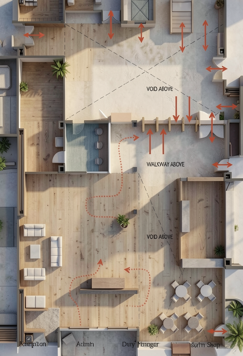 create a serene modern poolside setting the atmosphere is tranquil and inviting use warm beige tones for the plush outdoor seating and chaise lounges complementing the off white textured walls enhance the lush green of the large tropical plants for a touch of nature the water in the pool is a clear deep blue with gentle reflections adding a refreshing contrast the ceiling features unique architectural shapes in muted gray adding depth and interest soft ambient lighting casts a cozy glow over the scene creating an atmosphere perfect for relaxation and leisure