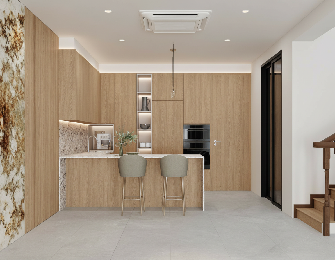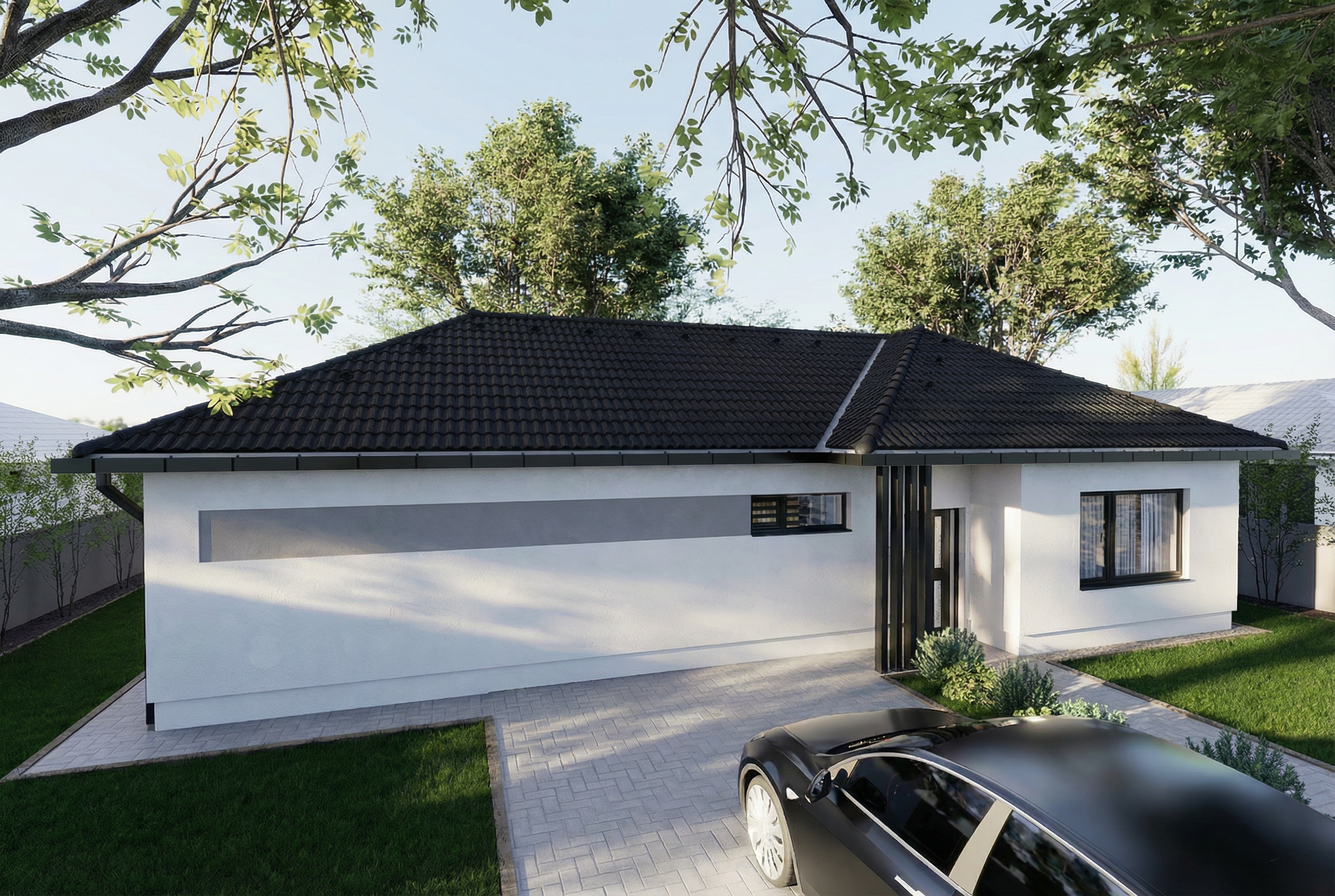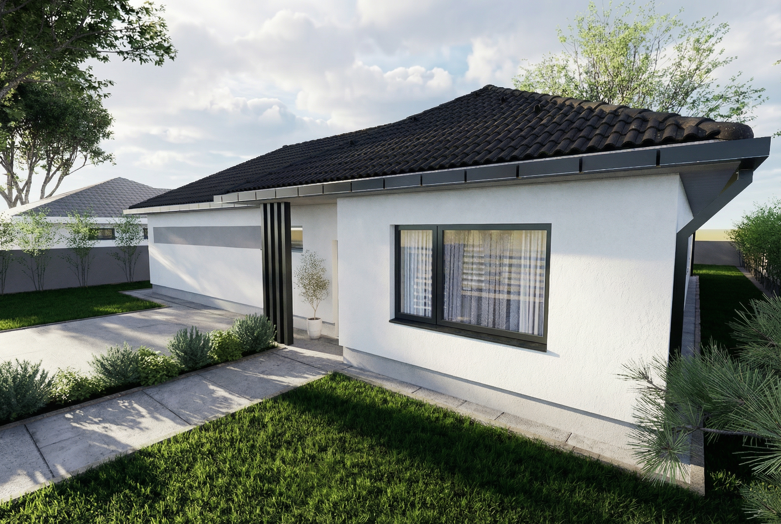 strictly preserve all architectural elements no design changes allowed no creative reinterpretation no stylization only enhance photorealistic lighting shadows and light balance result should look like a real architectural photograph of the same scene make the lights less yellow make the grass lighter