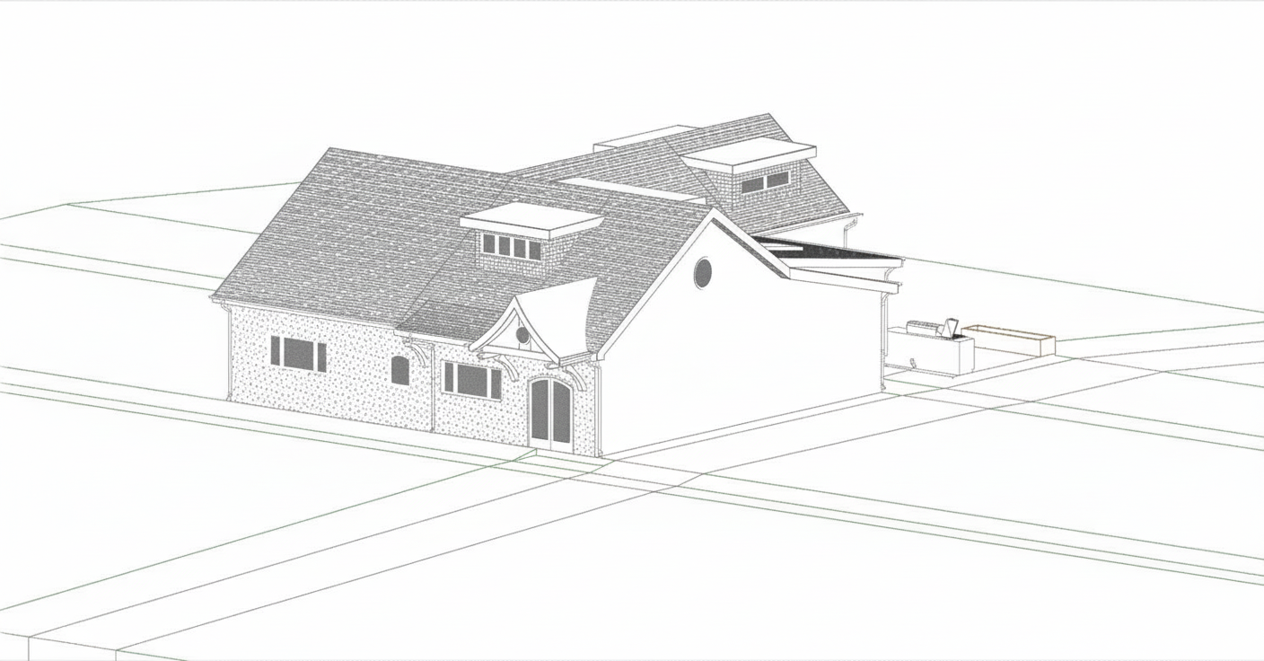 add natural lighting make look realistic the trim is dark navy blue the light blue on the house is stucco there is a pickleball court on a slightly higher elevation than the house add surrounding trees and nice landscaping there is a residential road behind the building on the left which is slightly lower than the house there is no fence around the court the railing on the deck is metal and wire