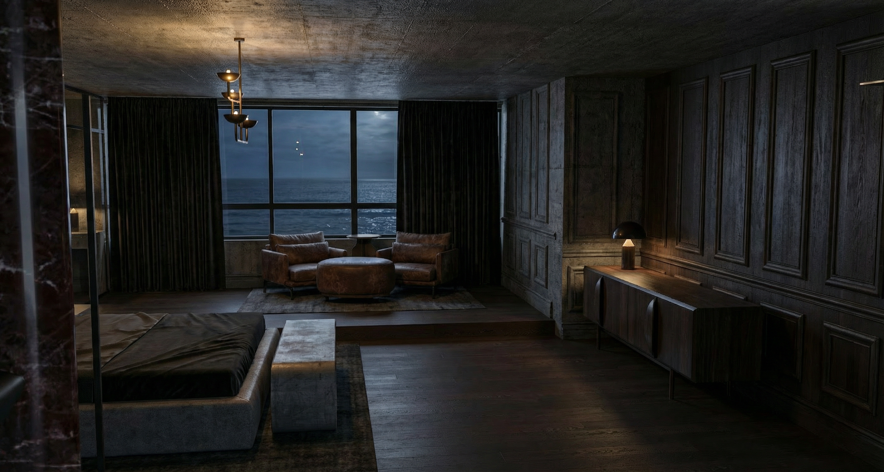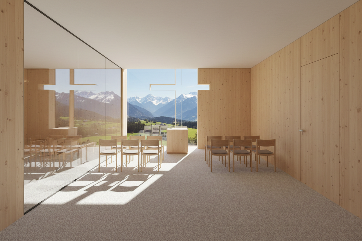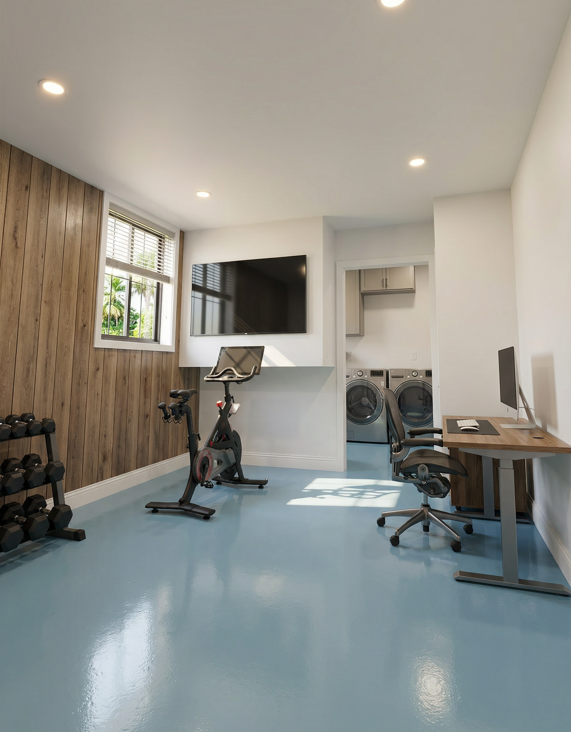 can you render this interior perspective for a kitchen remodel please use a medium brown modern shaker style for the cabinetry countertops should be white solid surface hardware should be gold somewhat moder range hood to me high end windows and door casing should be white walls to be very light grey make flooring a wide plank natural wood stainless steel appliances and range hood