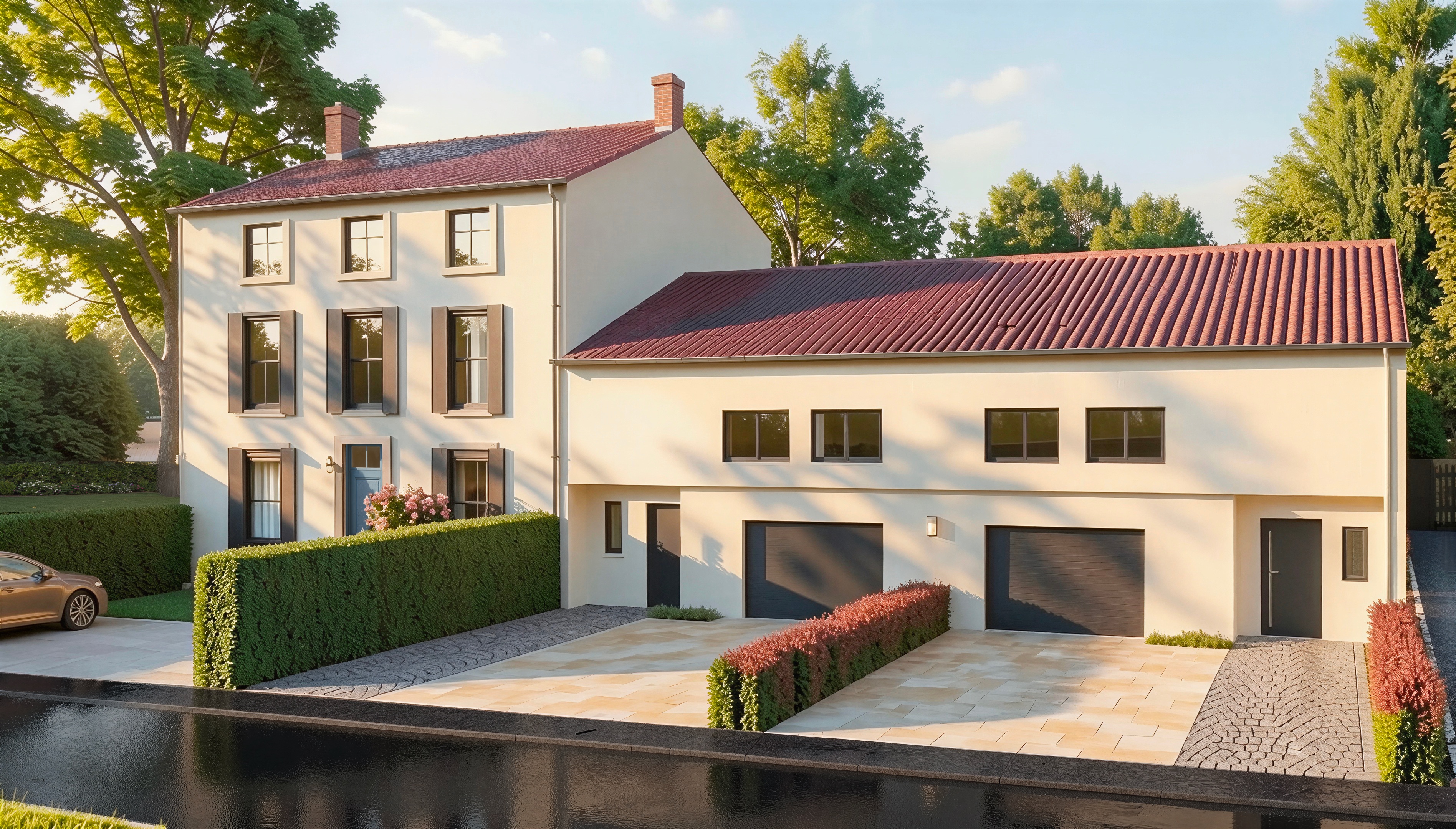 add a path along the side of the right house add trees on the other side of this path