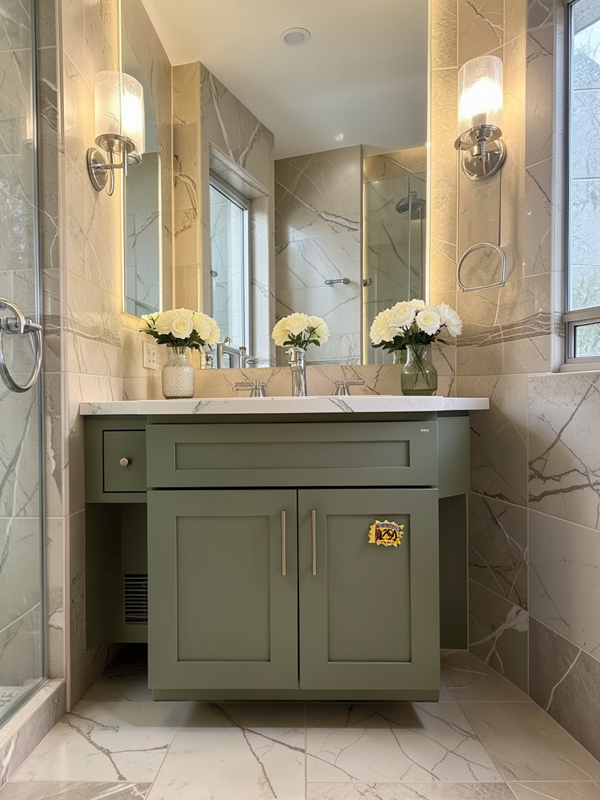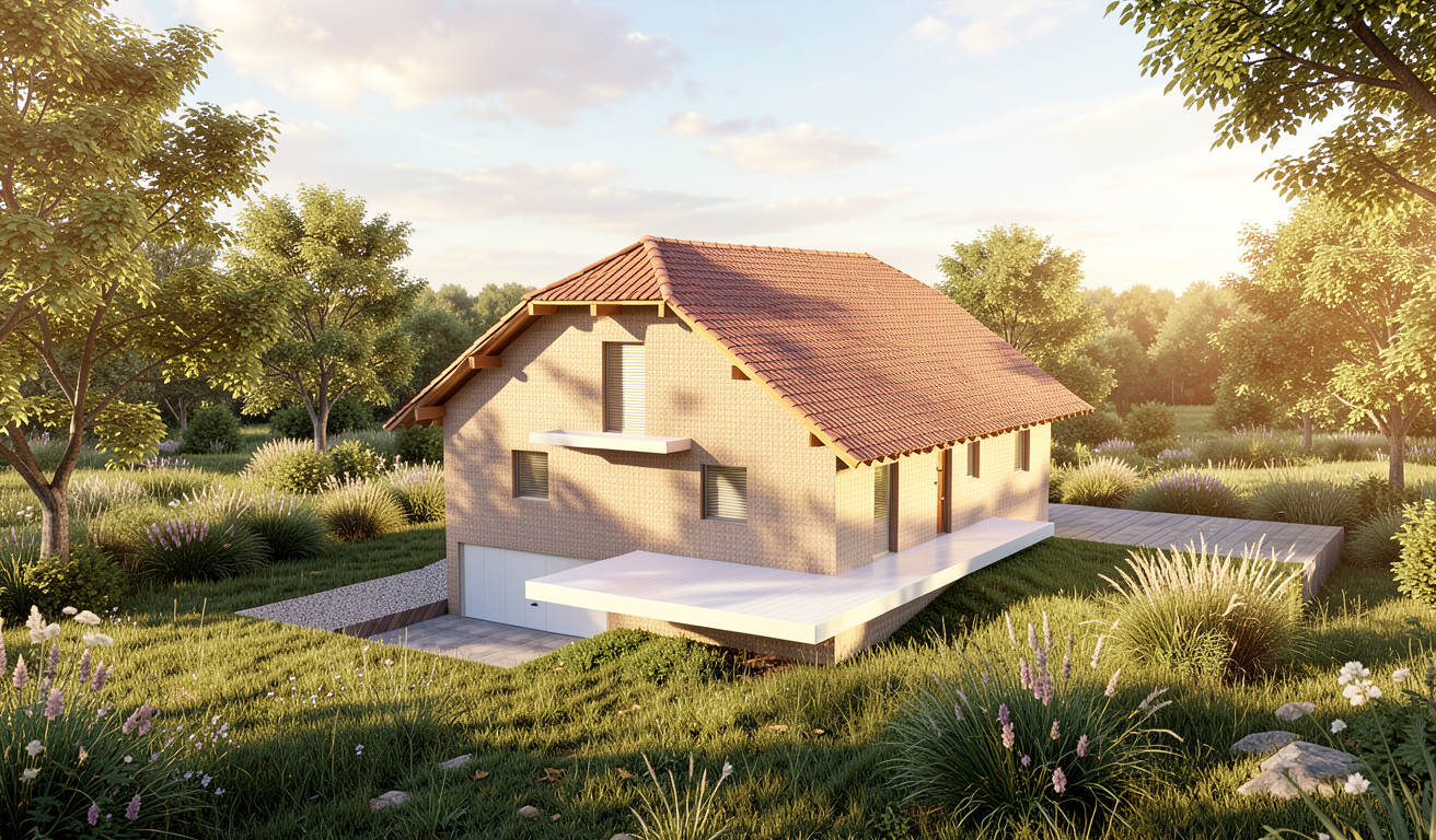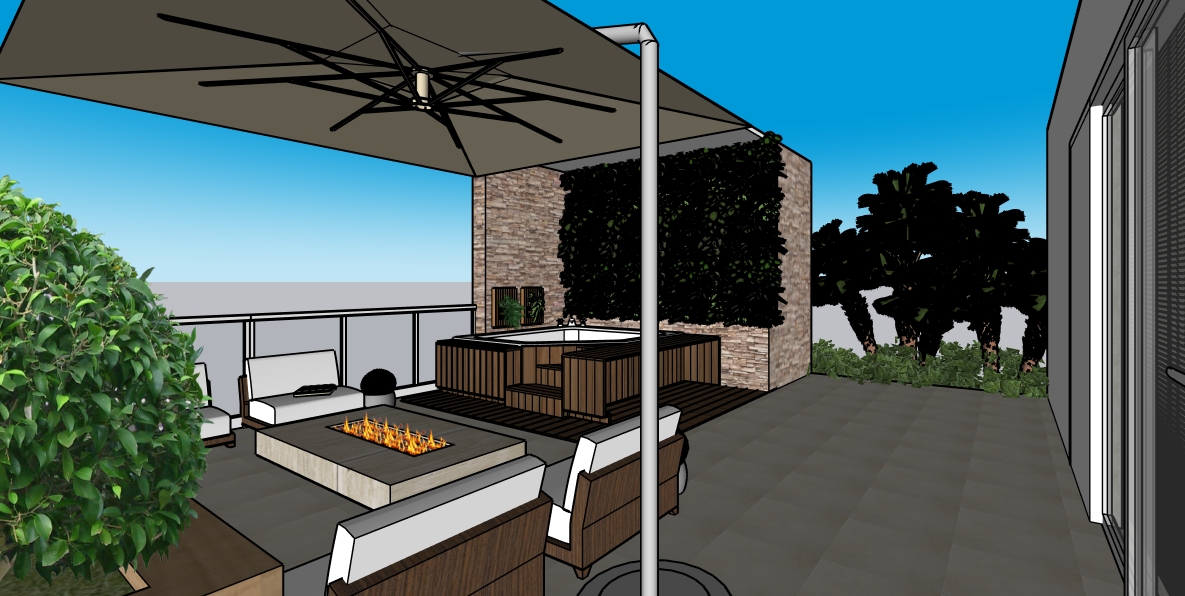 render a luxurious modern outdoor patio with a sophisticated atmosphere include a sleek fire pit with a warm glowing flame use a light taupe for the seating area fabric complemented by rich dark brown wood the stones on the wall should be a mix of soft beige and sandstone hues incorporate vibrant green for the plants and bushes to add freshness the floor should be slate gray and the sky a clear bright blue indicating a calm sunny day ensure the canopy is a neutral stone color creating a relaxing shaded area as background a lake and mountain view
