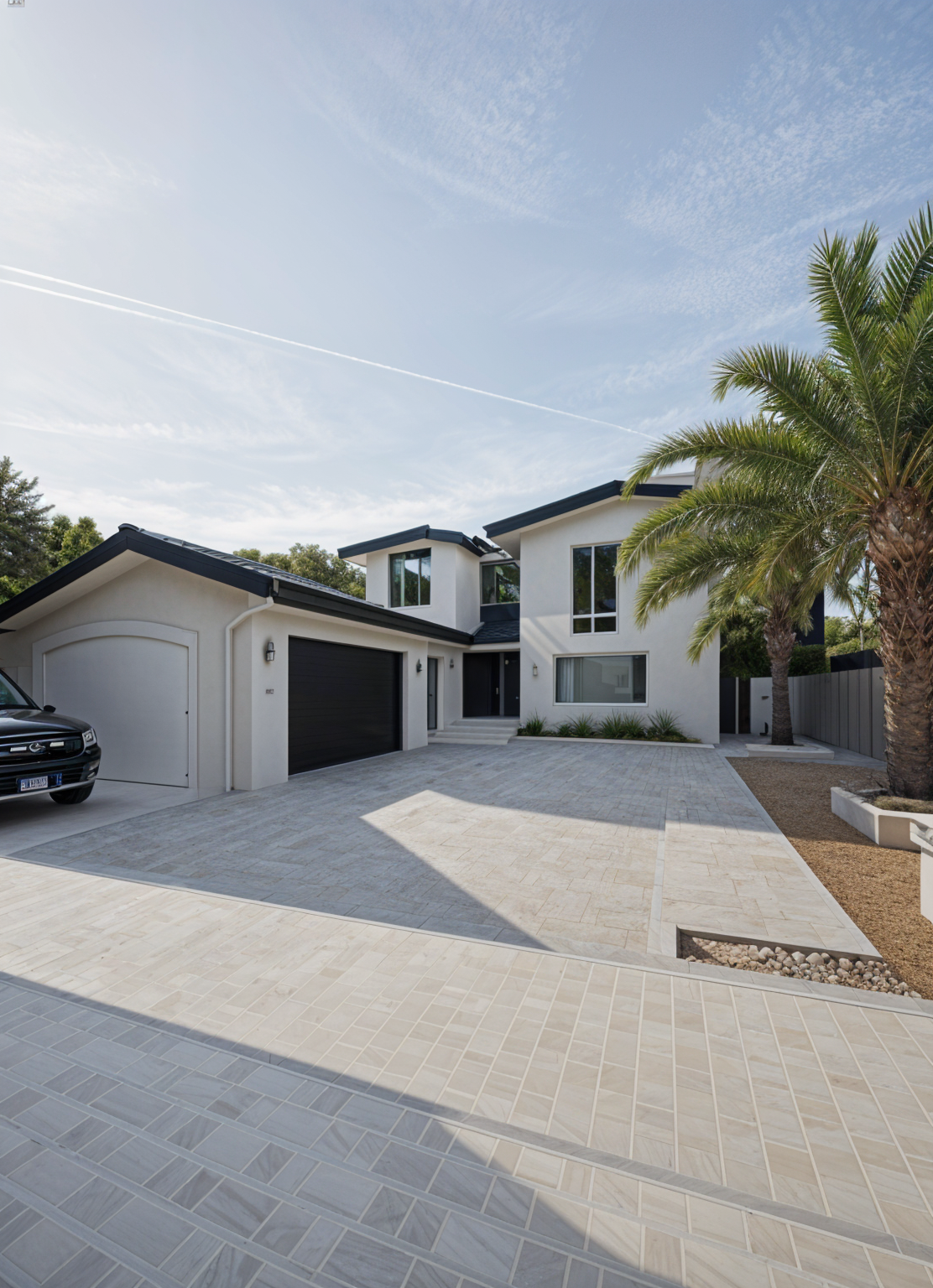 international style exterior shot add extension on top of garage with black georgian windows make house white bring front door forward near garage on 45 degree angle architecture