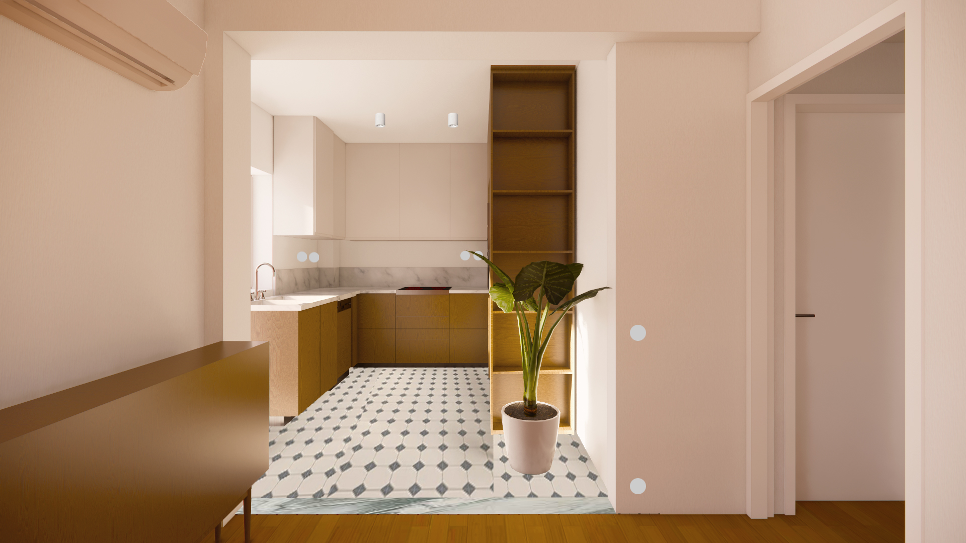make the tiles alignement better add books on the vertical group of shelves make the lements of the picture blend in better ambient mid day shot sun coming from left to right