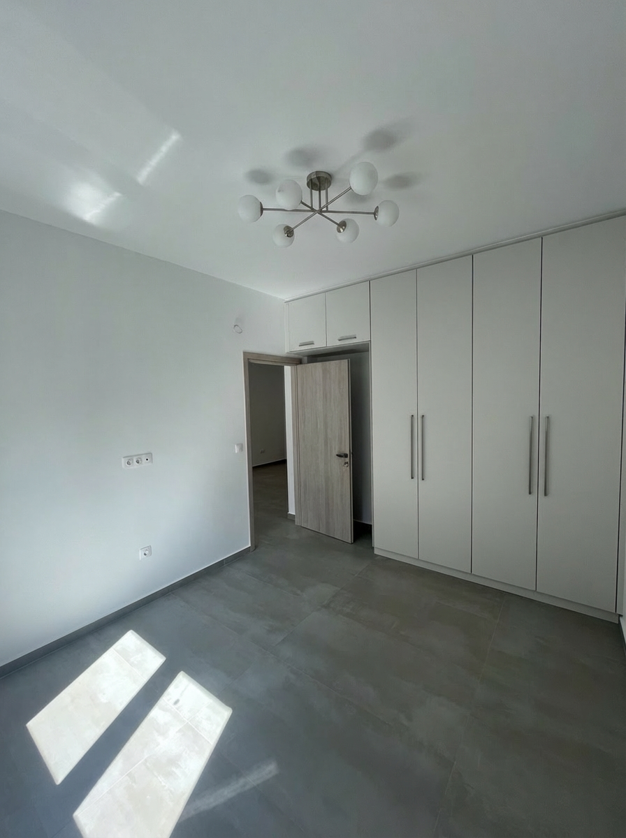 convert to a basic unfitted bedroom plain painted walls outdated wardrobe and light floors and door preserve exact layout and perspective