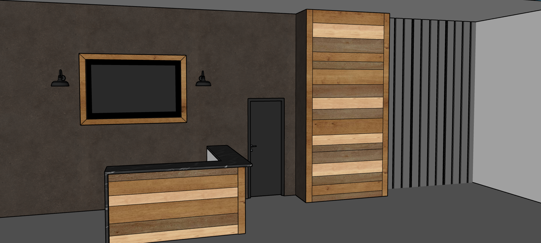 put a tv instead of the miror and the floor more light grey and the wall on the right is black sheet metal