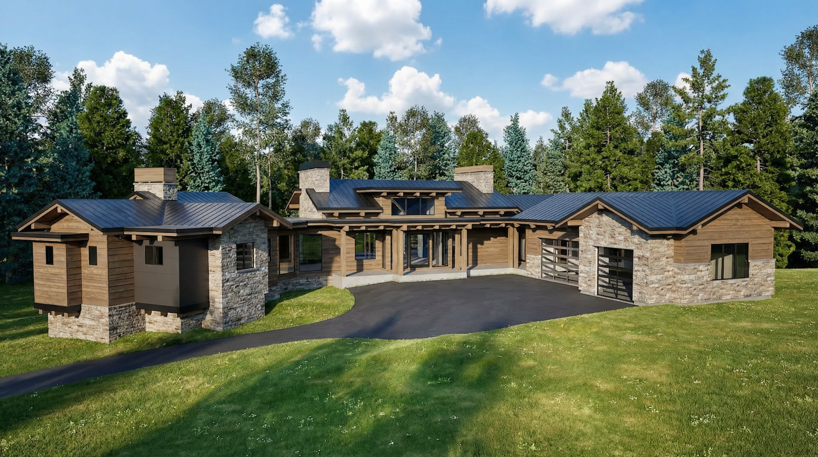 clean timber clad architectural wedding venue exterior rendered in cinematic morning lighting beautiful tennessee country landscape in the background dynamic rolling hills blue skies during the daylight wood doors asphalt around the building warm cedar board batten vertical wood siding with minimal grain pattern black standing seam metal roof natural wood textures high fidelity photorealistic visualization crisp shadow falloff refined facade geometry richly detailed grain patterns soft atmospheric depth premium architectural photography mood ultra clean composition and materials