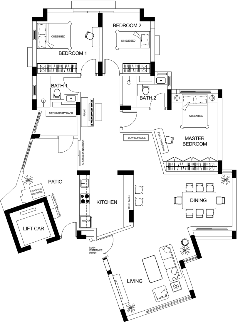 convert this floor plan into a modern isometric 3d view of a full house show the space from an elevated angle with furniture walls and details visible render a modern apartment layout with smooth elegant lines use a soft light neutral color palette with off white colour for the walls and oak vinyl tile for the flooring the living room to have a cozy cream sectional sofa and a plush beige rug add a sleek minimalist kitchen with glossy white cabinets and a marble countertop dark walnut dining table for the bedrooms use soft warm bedding and light curtains that allow natural light to pour in all windows are half height sliding windows half height windows at the patio without curtains with a washing machine as indicated bathroom to be simple in warm white wall tiles and light grey floor tiles all doors to be in oak wood laminate finish piano set to be in black glossy finish console to have a display piece set a serene and airy atmosphere with subtle ambient lighting use the same furniture as shows on the plan do not change the orientation of the floorplan