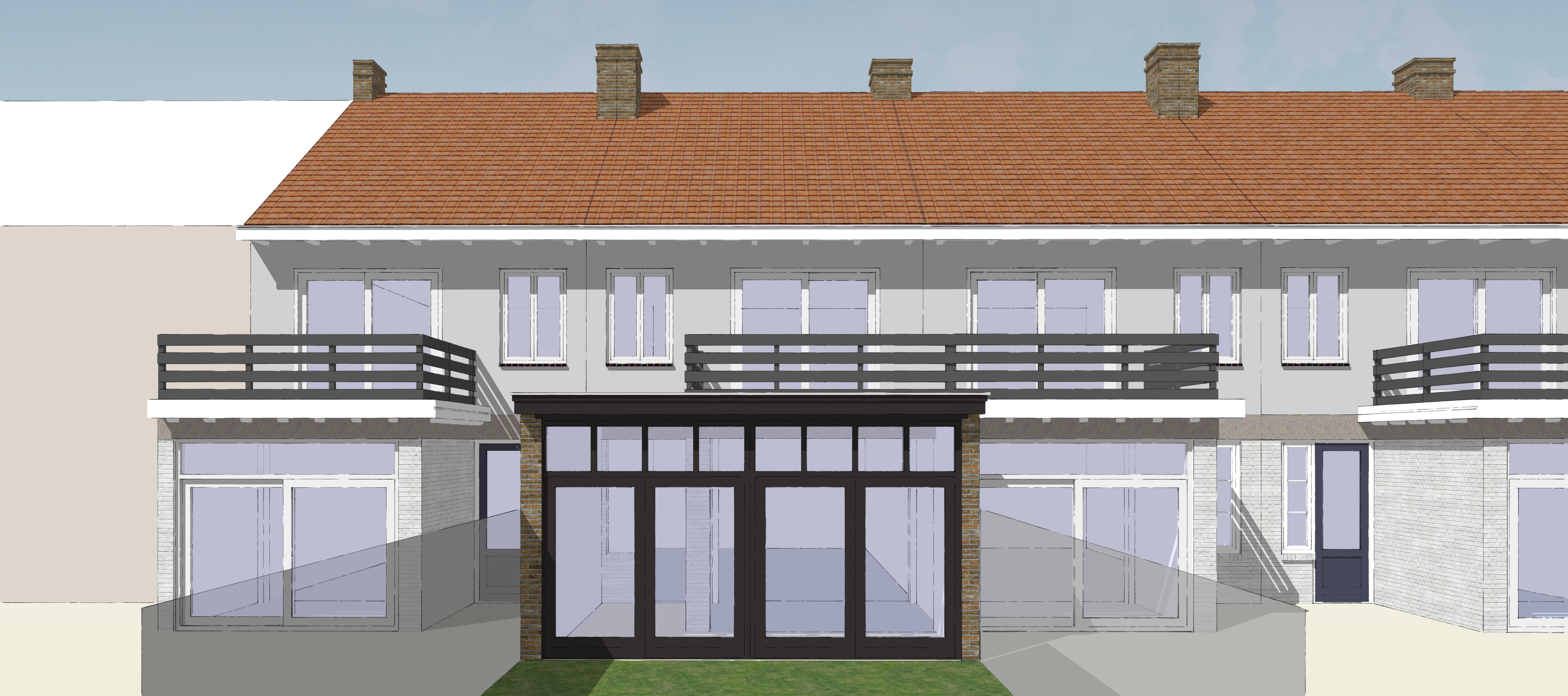 maak er een fotorealische afbeelding van met een aantal mensen rondom het huis en bloemen en platen in de tuin