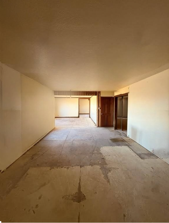 add cream cabinets to the right side wall start with a wall mounted oven and a microwave above that a stove top in the middle with a matching cream hood and a fridge at the end do not change the structure of the room