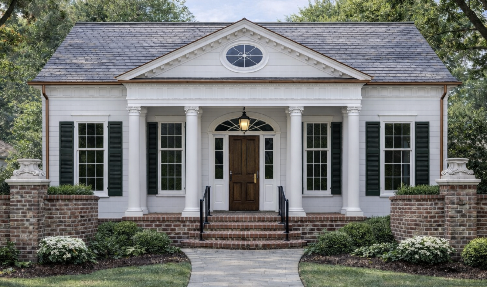 make this house wider but symmetrical with classy touches keeping the character of a greek revival style