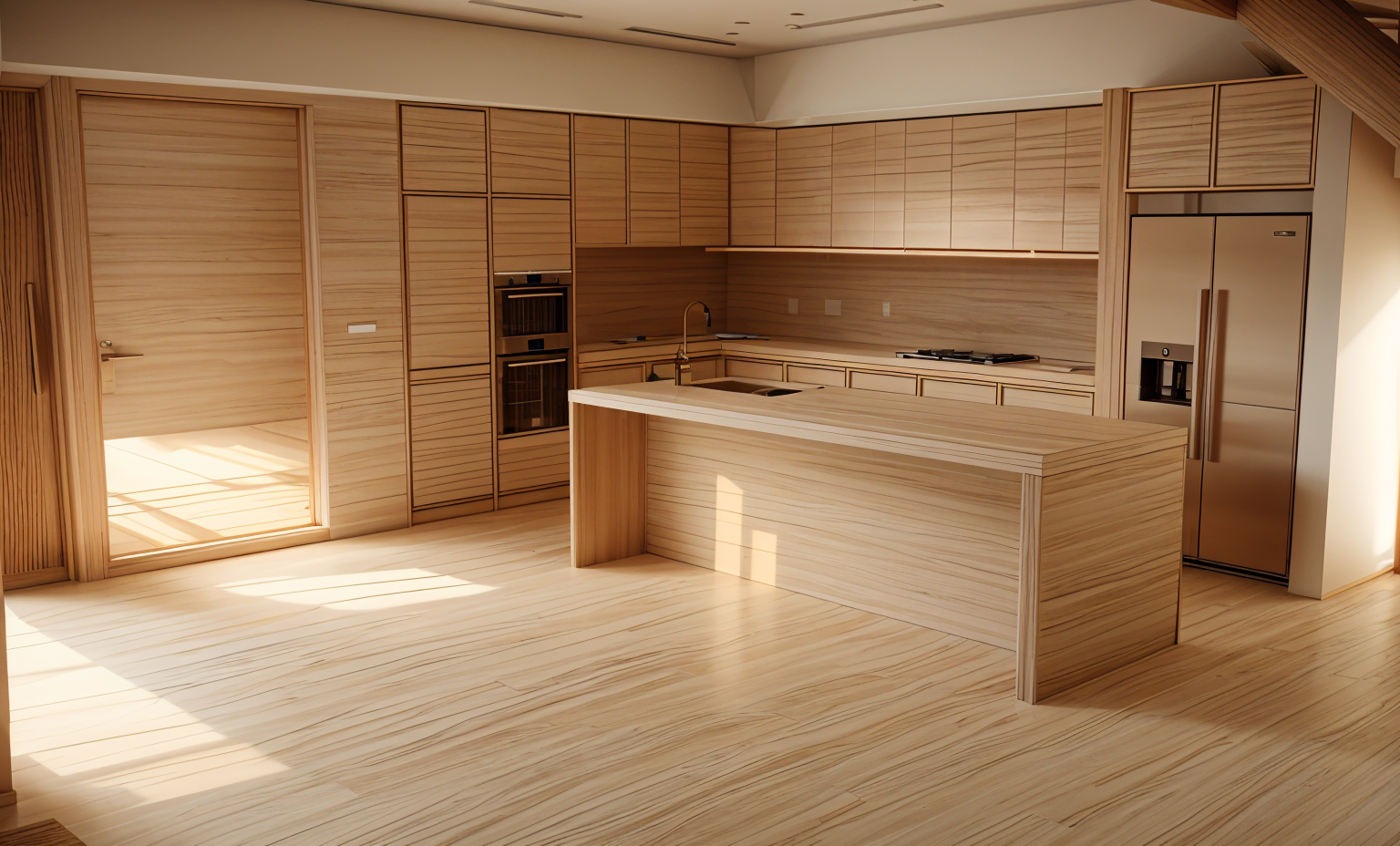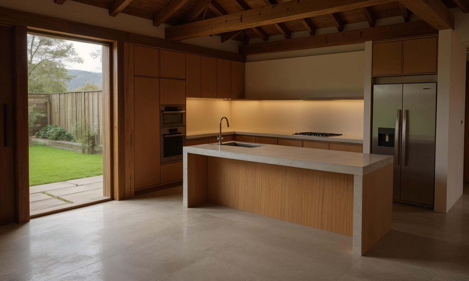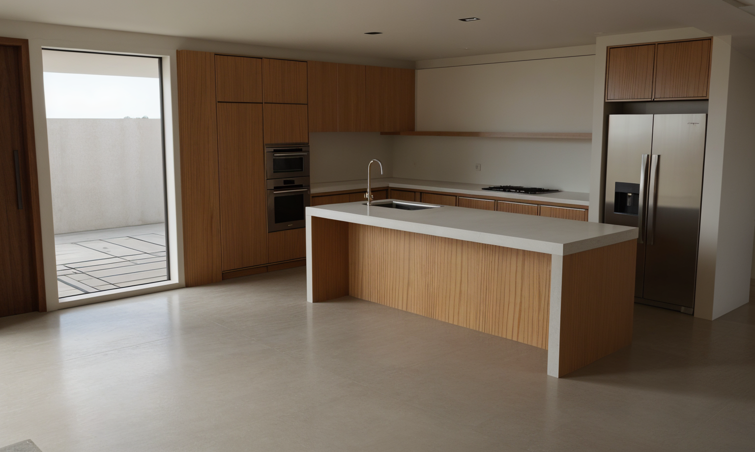 modernist interior shot with a fusion of japanese and scandinavian style house interior blending traditional architectural elements with minimalism features light birch wood warm natural materials and clean lines sunlit warm polished concrete ground floor living space with earthy tones white plaster walls japanese details subtly integrated into modern design architecture