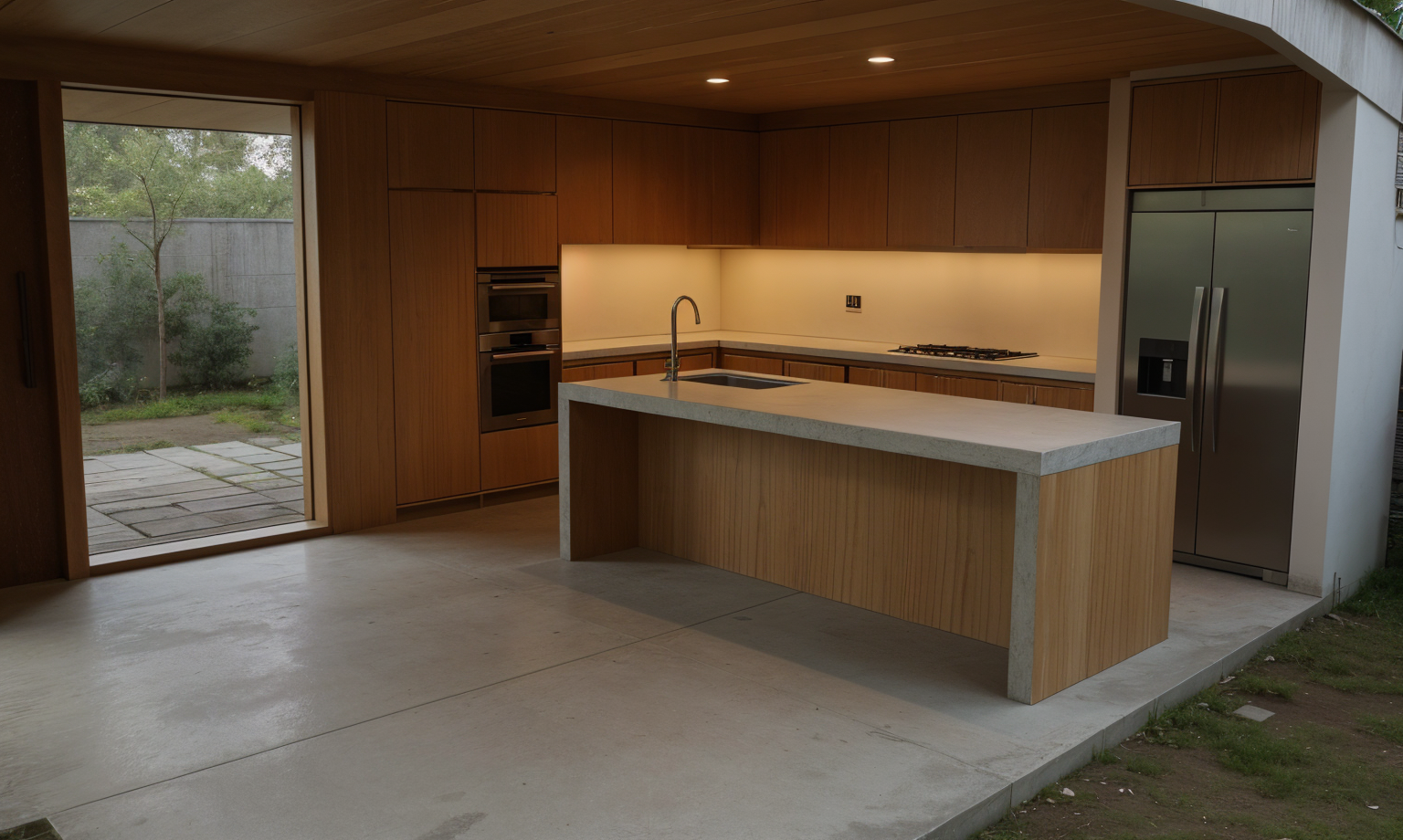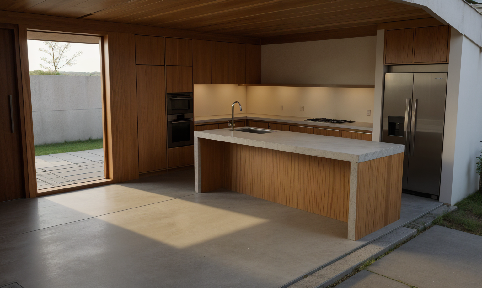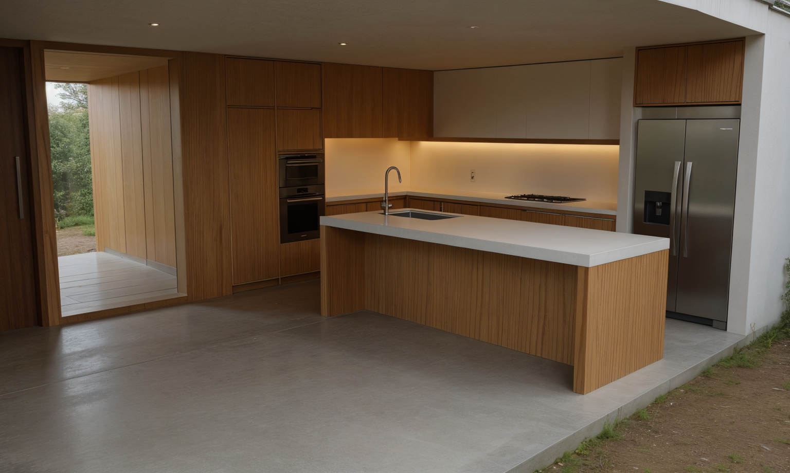 modernist interior shot with a fusion of japanese and scandinavian style house interior blending traditional architectural elements with minimalism features light birch wood warm natural materials and clean lines sunlit warm polished concrete ground floor living space with earthy tones white plaster walls japanese details subtly integrated into modern design architecture