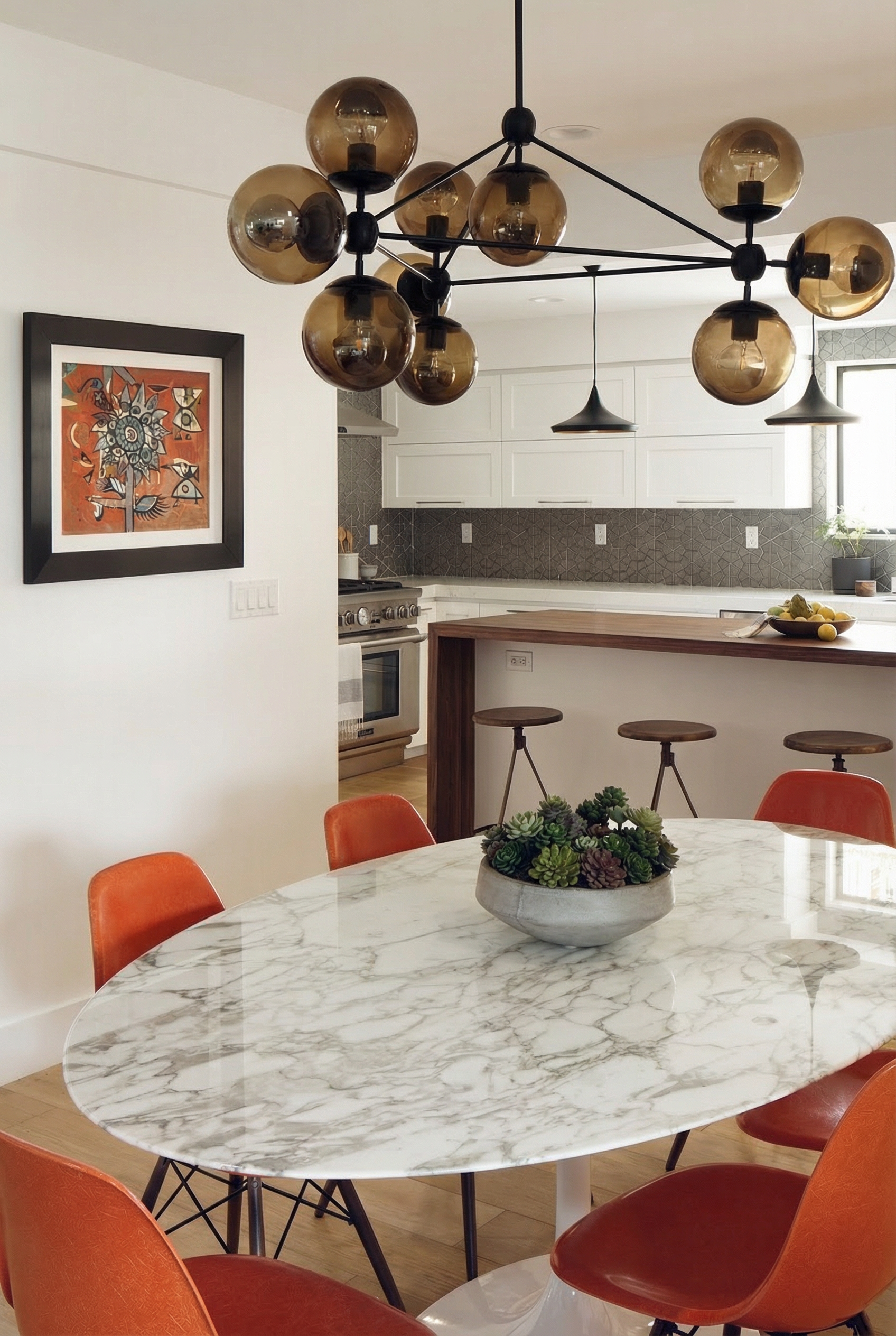 a contemporary kitchen with a stylish and modern design the central feature is a large marble island with a unique irregular shape complemented by four high stools with beige fabric seats and black metal frames above the island a sleek black pendant light fixture with multiple black pendant lamps adds a dramatic touch the cabinetry is a mix of light wood and white tones with open shelves displaying plants and decorative items the appliances including a oven and hood are modern and integrated seamlessly into the design the floor is light wood and the space is well lit with natural light streaming in through large windows framed by light transparent curtains architecture