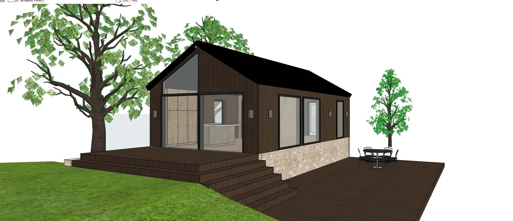 a modern house rebuilded on a old brick wall from a old house the wall is covered in rich dark wood and through the window you kan see a modern kitchen in oak lights needen on the outside and the inside norwegian nature surround the house