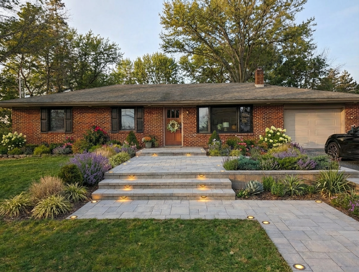 absolute rule keep all house geometry windows doors roof and garage exactly as in the photo only modify the front step sidewalk to be warmer colored pavers