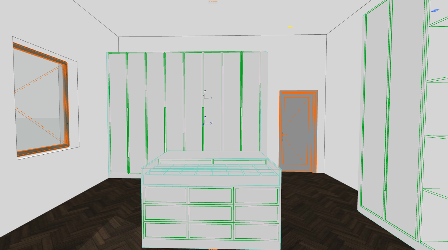 create an ultra realistic luxury walk in closet interior render based exactly on the provided archicad screenshot keep the same architecture wardrobe layout island position shelving composition door and window positions floor pattern proportions and camera angle exactly as shown do not change the design or geometry in any way main goal make this render look fully realistic refined and professionally photographed not cgi improve realism in materials lighting reflections shadows texture depth and all interior details keep the atmosphere elegant minimal warm and premium wardrobes the wardrobes should be creme color mdf use a smooth premium painted mdf finish in a soft warm creme tone finish should be matte or eggshell matte elegant and minimal do not make it yellow glossy or too cold grey keep the wardrobe surfaces very clean refined and realistic center island keep the center island exactly as shown make it realistic and high end with the same creme mdf finish as the wardrobes the top surface should feel premium and clean the upper part can read as a glass top jewelry accessory display surface realistic and elegant floor keep the floor as oak parquet herringbone wood flooring make it realistic with natural oak grain correct plank scale subtle tonal variation realistic joints and a premium matte finish add believable light reflection and natural wood depth window and door remove all opening lines from the door and window keep the openings clean minimal and realistic make the door elegant and realistic keep the window minimal and realistic with soft daylight styling add subtle luxury walk in closet styling to make the room feel real inside the visible shelves and wardrobe areas add tasteful fashion related accessories such as a few folded clothes boxes handbags shoes and elegant storage items keep the styling very refined balanced and not cluttered the island can have minimal luxury accessories but keep it clean lighting and realism use soft natural daylight combined with subtle refined interior lighting add realistic contact shadows ambient occlusion soft reflections and natural light falloff make the room feel polished warm and believable like a real editorial interior photo material realism improve realism of mdf glass wood flooring wall paint and all details add subtle imperfections and realistic material response keep everything high end minimal and elegant important do not change the design do not change wardrobe proportions island position shelving layout or wall composition do not move architectural elements only improve realism lighting material quality and subtle closet styling add this line too make the final image look like a professionally photographed luxury walk in closet with creme matte mdf wardrobes realistic oak parquet flooring refined daylight and elegant minimal styling