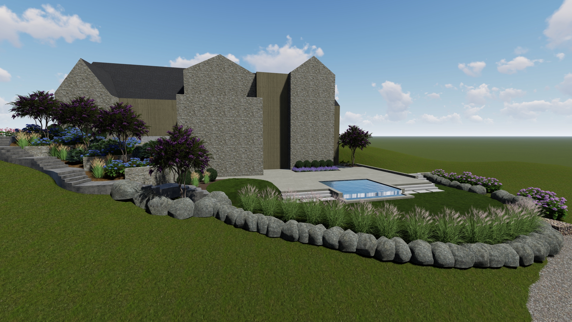 add furniture around the pool leave the rest the same make the grass lawn look more realistic
