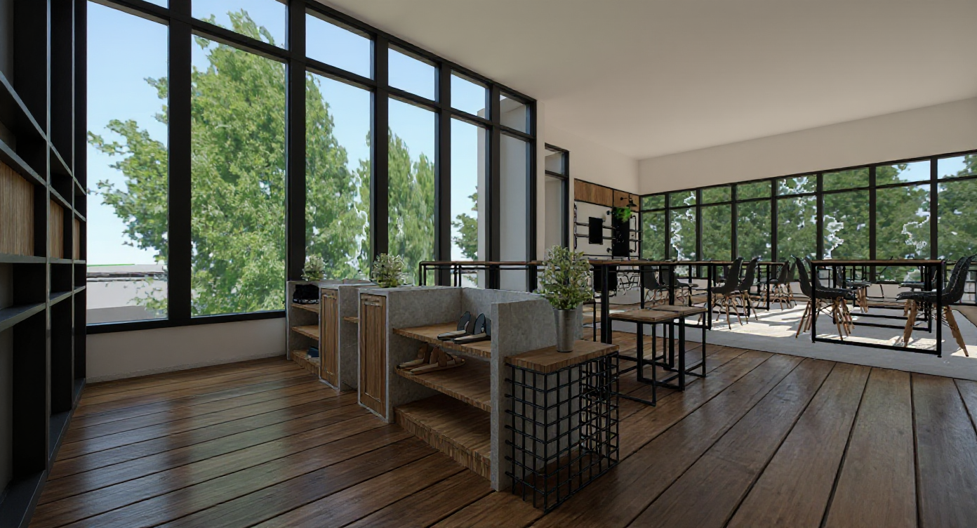interior shot please make the picture have a nice scandinavian feel the kitchen is matte white with a natural oak worktop and backsplash the floor is similar natural oak laminate flooring the sofa is soft beige the wall is rosemary branch the dining table is white surrounded by beige dining chairs