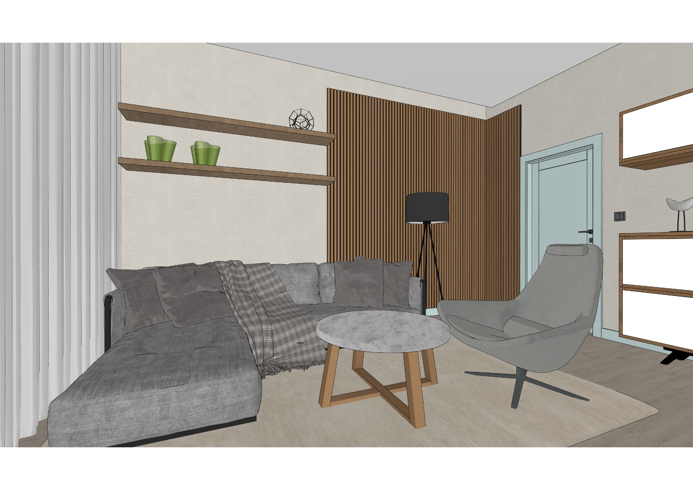 absolute priority rule the scene must remain 100 identical to the reference image any modification addition removal reinterpretation or adjustment is strictly forbidden except the explicitly defined changes below do not change geometry layout objects or composition do not add any objects decorations flowers plants or details of any kind no creative interpretation is allowed allowed adjustments only these two wallpaper color adjustment change wall finish to earthy beige tone with warmer brown undertone still subtle elegant not dark ceiling detail adjustment suspended ceiling must remain perfectly flat in one continuous plane create 15 cm gap between ceiling and wall insert led strip inside the gap light direction soft indirect wall washing downward light must be subtle continuous and not visible as a direct source materials locked light wooden floor with beige area rug approx 2 cm cut pile coffee table american walnut base marble top tv cabinet and wall cabinets american walnut white semi gloss laminate acoustic panels vertical walnut slats on black background walls earthy beige vinyl wallpaper with slight brown undertone fine textile texture door frame and skirting light olive matte finish ceiling flat white surface with 15 cm recessed gap and integrated led strip sofa grey textile upholstery armchair matte fabric floor lamp black lampshade matte shelves walnut wood keep existing objects exactly as they are lighting daylight from behind camera primary light daylight from windows behind the camera soft frontal illumination even light distribution no harsh shadows natural gradient into depth led strip subtle indirect lighting soft wall wash secondary to daylight neutral white balance global illumination physically accurate gi soft contact shadows natural light bounce ambient occlusion in corners and slats balanced exposure ultra realism system micro detail walnut grain marble roughness textile fibers slight film grain 1 1 5 microcontrast boost soft highlight roll off shadow depth soft but readable contact shadows depth via ao material contrast slat shadows no flat rendering reflection control physically correct reflections no perfect surfaces marble soft reflection laminate controlled semi gloss ceramic matte exposure color no burned whites preserve detail neutral grading natural tones camera original camera unchanged eye level 35mm equivalent output 8k resolution photorealistic luxury presentation quality final lock final rule the output must be a photorealistic version of the exact same scene not a redesigned or modified version only the explicitly defined adjustments are allowed everything else must remain unchanged