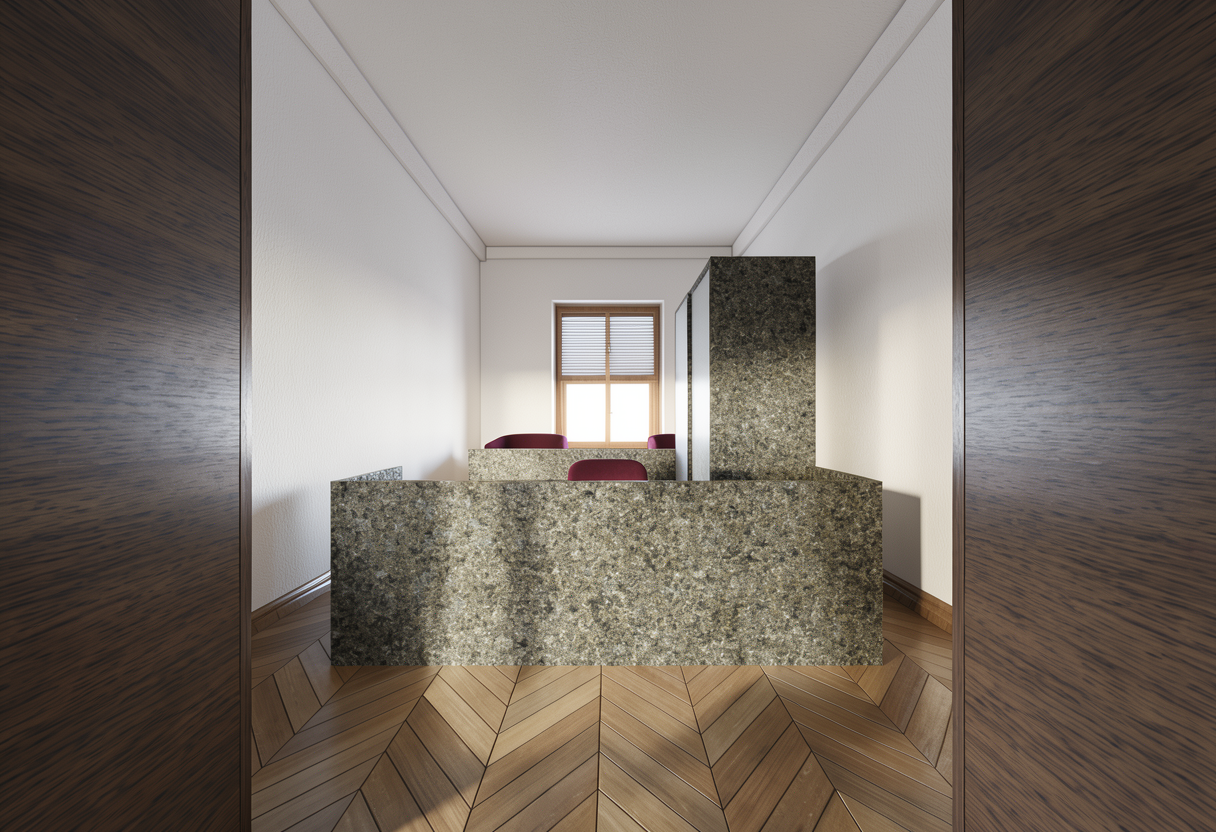 archsynth prompt view 01 reception room doorway perspective critical instruction the provided base render must be treated as the exact and fixed spatial reference all architectural elements furniture positions proportions and camera perspective must remain unchanged do not alter spatial layout furniture placement furniture scale or proportions camera angle or composition distances between objects your task is strictly to apply materiality lighting detailing and stylistic treatment inspired by the pinterest mood board without modifying the underlying design or geometry project context interior visualization of a reception room in casa presei libere bucharest camera viewpoint positioned at the doorway looking inward along the central axis of the room room characteristics fixed and already represented in the base render rectangular space white walls white ceiling with perimeter moulding herringbone wood floor double window on the far wall not directly visible but influencing lighting absolute constraints the base render composition must remain unchanged do not reposition any furniture do not resize any objects do not replace the spatial layout do not redesign the silhouette of existing placed objects do not introduce new major furniture elements that alter composition only the following are allowed material upgrades surface detailing texture refinement lighting enhancement subtle decorative elements consistent with the scene existing elements to preserve exactly central furniture monolith reception desk hospitality module shelving keep identical footprint segmentation and proportions do not change its overall volume or placement reception desk and integrated chair hospitality module fridge coffee storage shelving element waiting area two chairs one side table glass plexiglass all positioned exactly as in the base render design intervention style application only apply a design language inspired by a mid century eastern european modernist office aesthetic consistent with the pinterest mood references material direction introduce warm wood veneers walnut teak tones on the monolith surfaces use matte refined finishes for planar elements add subtle brushed metal accents thin trims base details preserve or reinterpret plexiglass glass elements with clarity and realism monolith treatment emphasize horizontal layering through material contrast introduce subtle segmentation via material transitions recessed joints shadow gaps maintain a strong grounded monolithic appearance reception desk refine surface materials and detailing only do not alter shape or placement use a clean functional mid century inspired aesthetic waiting area seating update upholstery materials and visual styling maintain identical placement size and orientation use low profile mid century inspired forms with restrained geometry side table preserve plexiglass construction ensure realistic reflections and transparency lighting enhancement maintain natural daylight logic coming from the far window introduce subtle layered interior lighting soft ambient illumination gentle highlights on wood surfaces minimal integrated accent lighting avoid dramatic lighting changes or theatrical contrast preserve realistic shadows consistent with the base render perspective atmosphere calm professional understated environment strong influence of mid century eastern european modernism material driven visual richness rather than geometric redesign cohesive realistic and photorealistic rendering visual outcome should feel like a refined material upgrade of the exact same scene not a redesign final output goal a photorealistic visualization that matches the base render composition exactly preserves all spatial relationships applies a cohesive material and lighting strategy inspired by mid century modern office aesthetics reflects the warmth restraint and material clarity of the pinterest references through surfaces and finishes only end of prompt