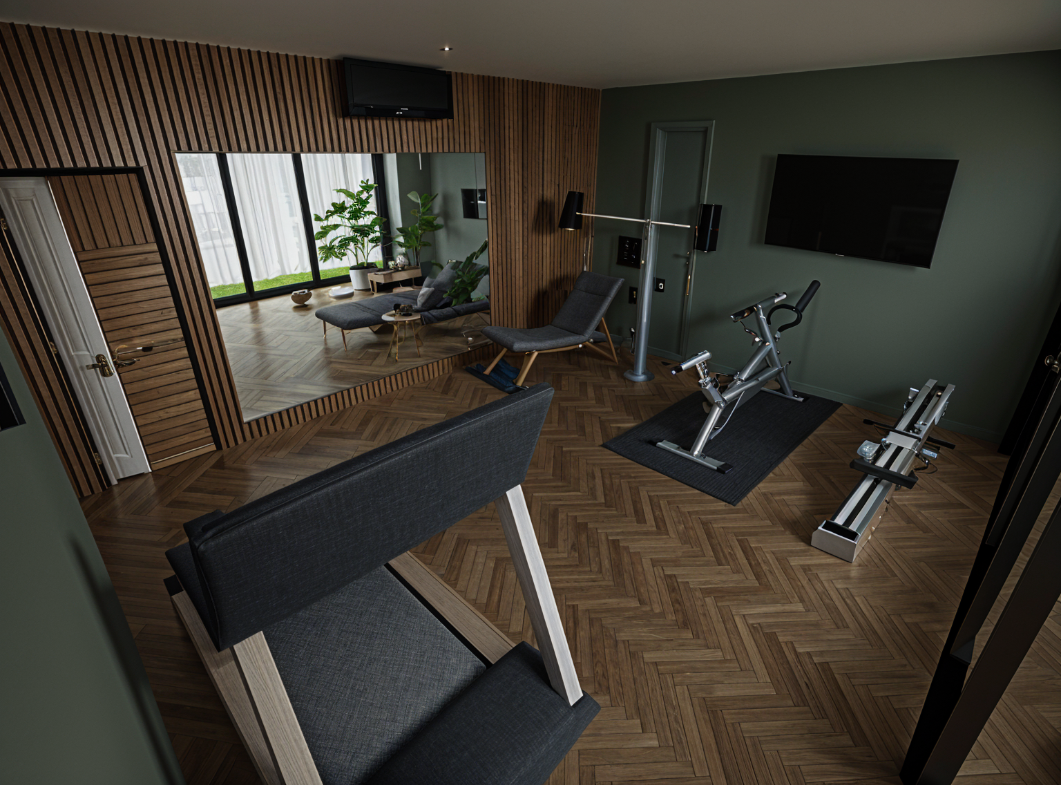 scene description a modern garden room located at the bottom of a landscaped garden the building features dark vertical timber cladding large sliding glass doors and minimalist detailing surroundings tall mature trees stand on both the left and right sides of the garden room naturally framing the structure on the left hand side a secondary path runs between the trees and the building adding depth and realism approximately 2 5 m behind the building an established cherry laurel hedge about 3 m high provides a dense green backdrop and privacy interior visible through the glazing a compact well equipped home gym from front to back a rowing machine an exercise bike and a smith machine at the rear wall lighting and atmosphere soft warm late afternoon sunlight with gentle shadows and realistic reflections on the glass and patio surfaces the mood is calm private and natural evoking a contemporary garden retreat that seamlessly integrates architecture landscaping and function camera framing eye level three quarter front right perspective showing both the sliding doors and side elevation with clear visibility of the patio and partial interior through the glass emphasize balanced composition accurate material textures