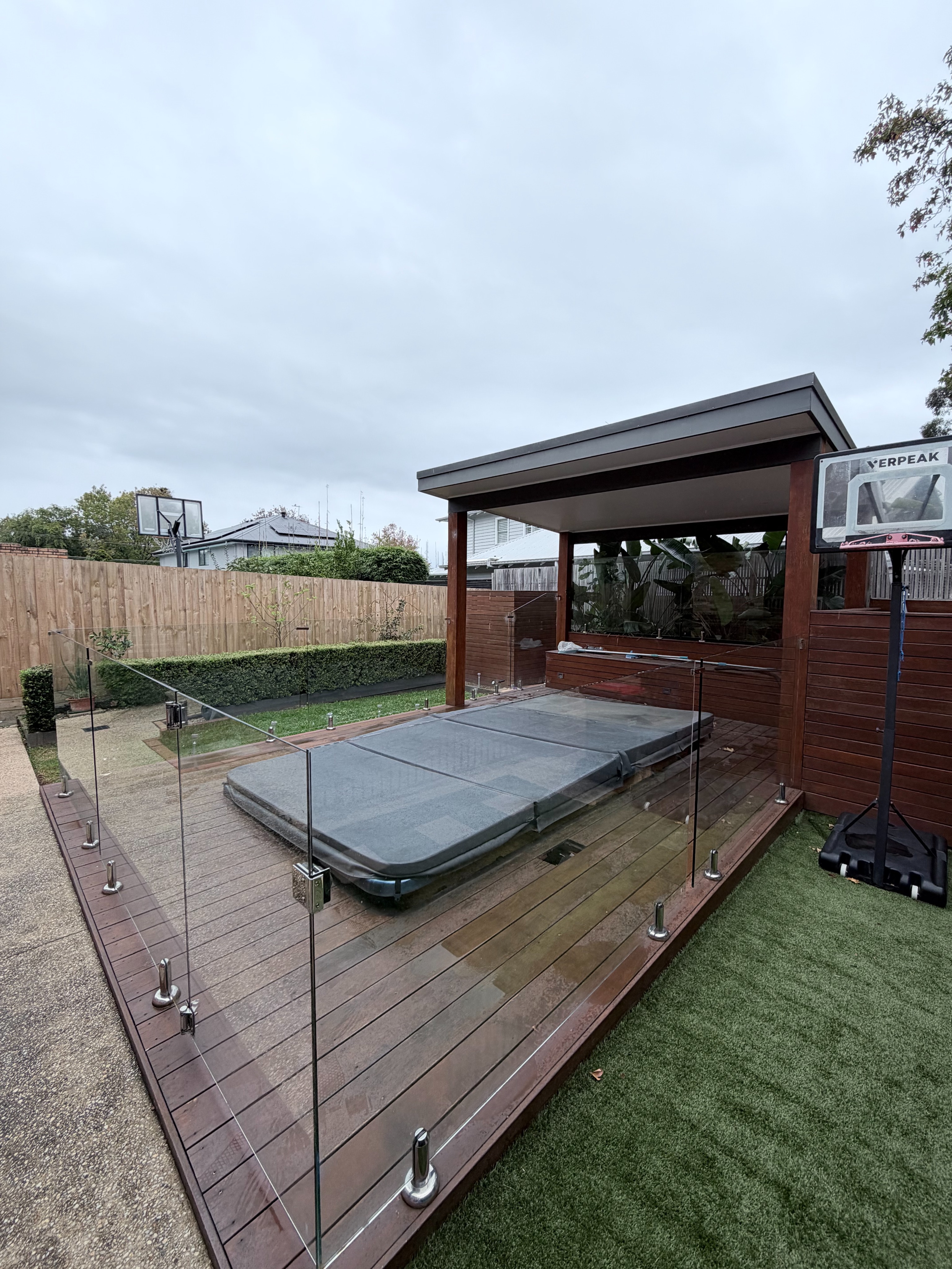 exterior shot a verandah in backyard with extra columns and extended roof the side wall are fitted with 2100 high glazing on side wall where the front is not enclosed architecture