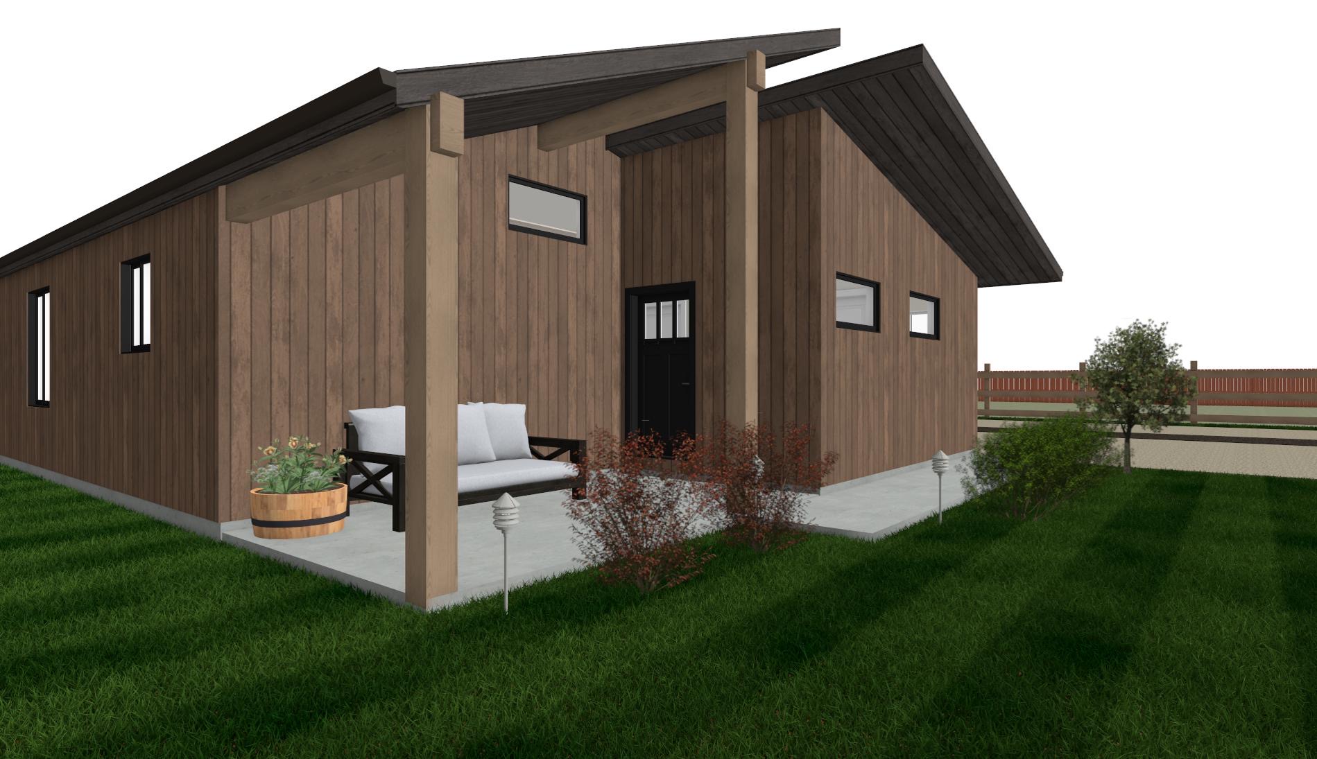 exterior shot make this photorealistic dark siding color change the patio to a rustic timber deck rustic landscape