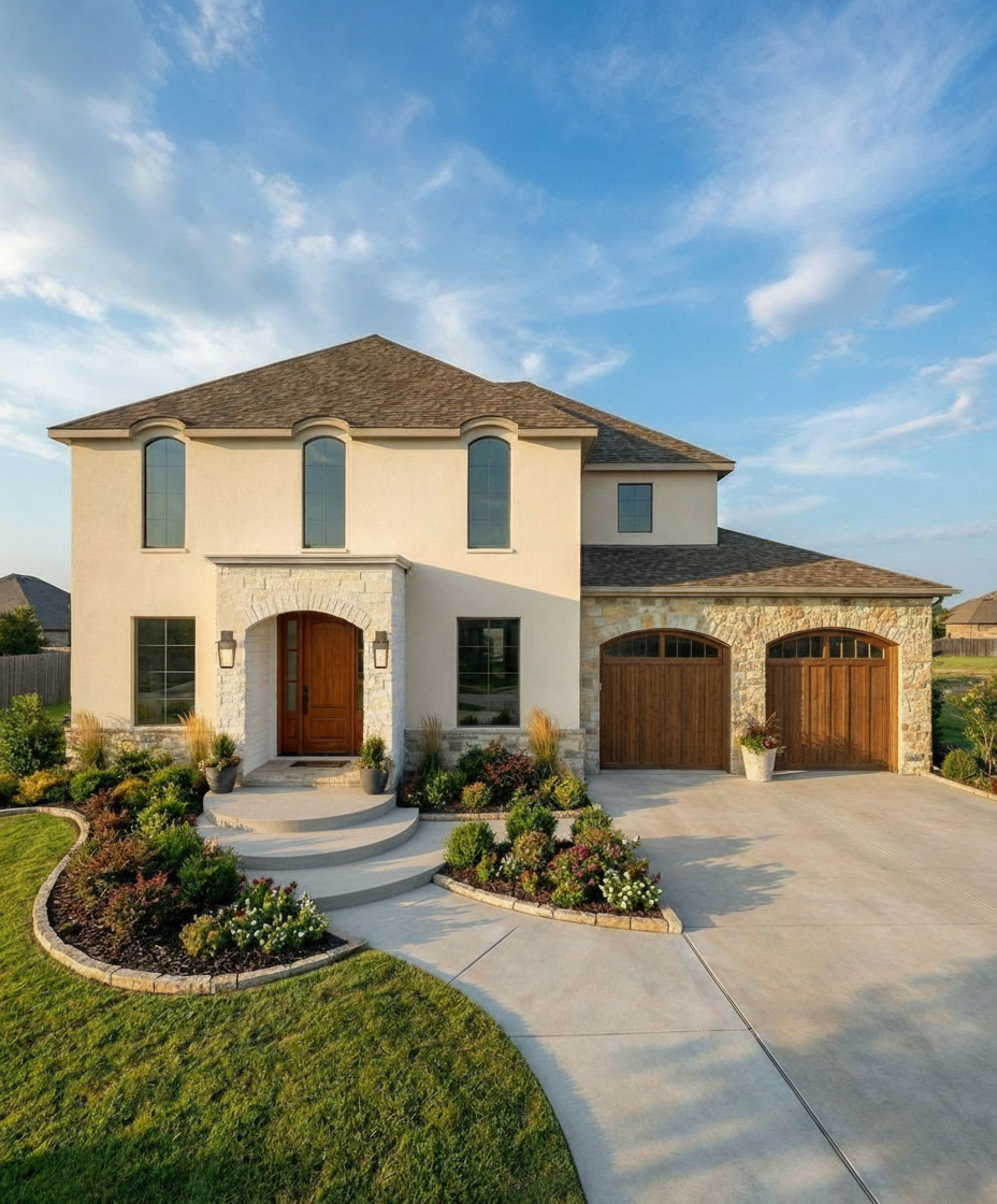 make the front door have some glass and be arched at the top wood tone to match the garage doors