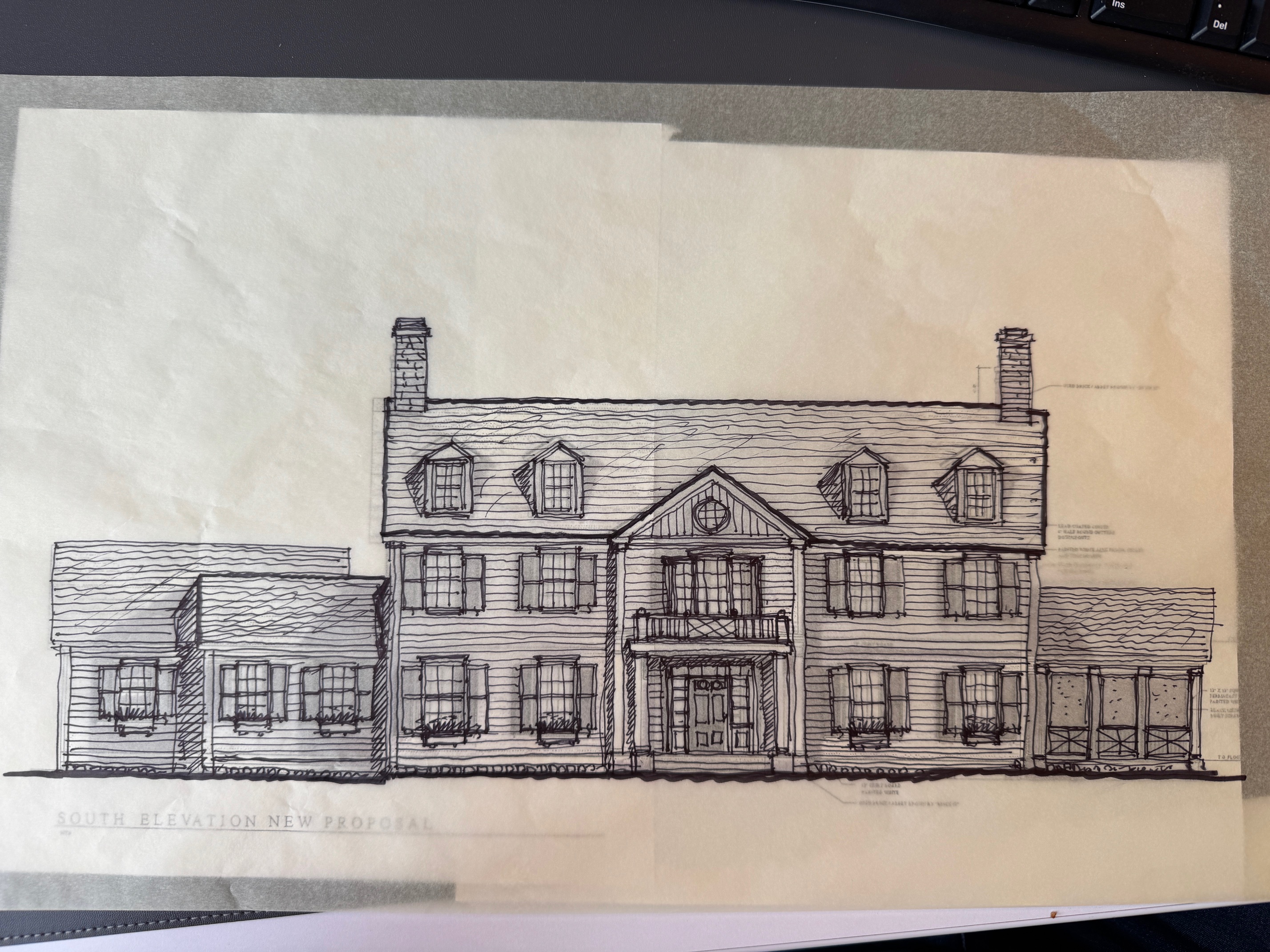 create a photorealistic rendering with white clapboard siding essex green shutters and window boxes weathered cedar shingle roof blue sky trees in background flowering bushes along foundation don t change design