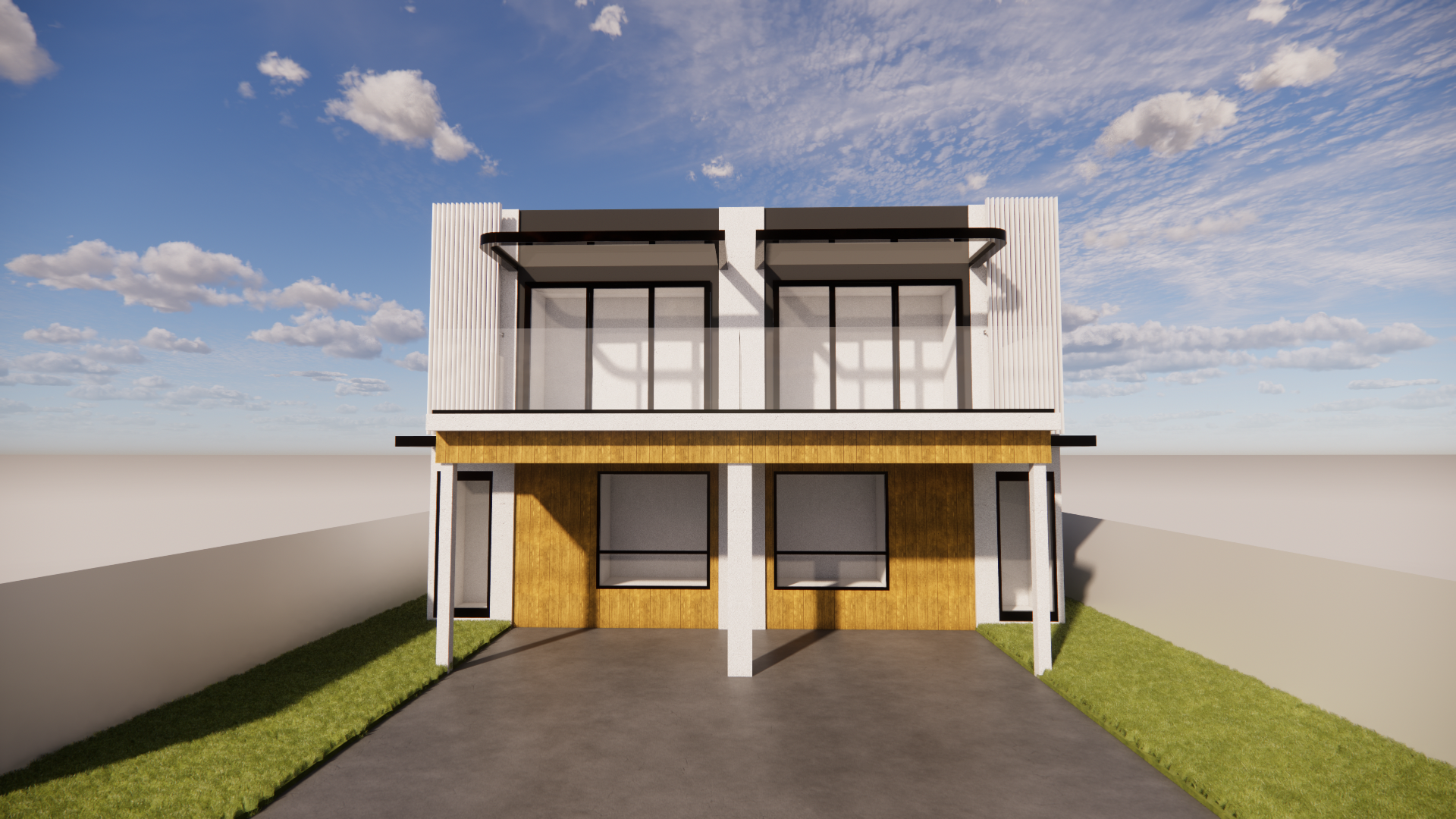 a front view perspective of a 2 storey townhouse in white paint and black paint white matte aluminium cladding at upper floor and vertical timber strip and white paint at lower floor entrance at the side with the front lawn and surrounding timber fence