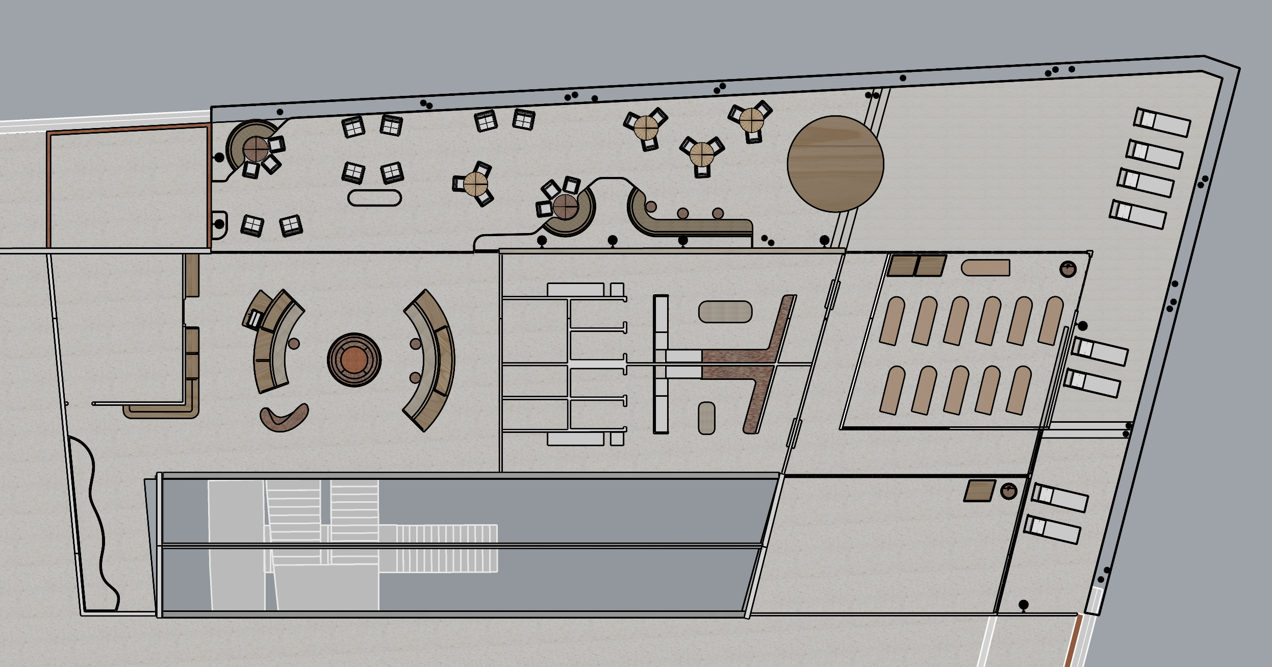 can you render this floorplan with materials there are materials there now but you need to make it more real and apparent overall floor surface is light terrazzo the counters in the corner of the changing rooms are red terrazzo the counter of the curved reception desk is red terrazzo as well the round central sink is in red terrazzo with terracotta as the core the wood is pine wood the white wide band wraping the edge and top right corner is terracotta planters so fill inn plants in these as well as the freestanding oval planter that is placed behind two of the chairs on the outdoor terrace as you can see there are three bespoke sofas out on the terrace two round ones and one that is curved and then ends straigth these sofas are in wood with textile on the seat and backrest there are also the same terracotta planters behind wrapping these bespoke furnitures put plants in these as well on the right side there are two seperate rooms one with yogamats and one that is meant to have 5 reformer pilates benches as you enter on the left side out of the elevators you are met with an organic shaped planter along the wall that is made of the same light terrazzo as the floor put plants in this one as well do not change the overall layout and can you add toilets in the two stalls on the right side of the central ritual and one hcwc above the two toilets on the right side of these are 4 showers if you can show that as well