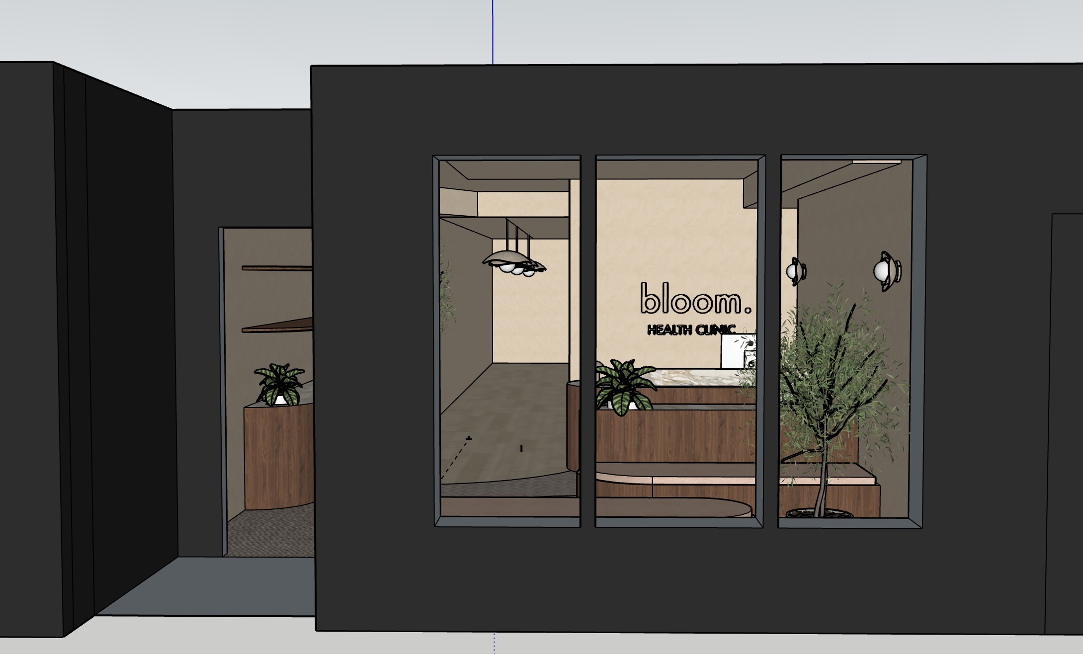 render a modern storefront of a health clinic with a sleek design the exterior is in a deep charcoal grey with large glass windows inside the walls are limewash in a light pinky beige the reception desk is crafted from rich walnut wood with a marble countertop and warm led strip lighting at its base add lush green potted plants near the entrance for a touch of nature the text bloom health clinic is elegantly displayed with warm lighting fixtures on the walls create a calm and inviting atmosphere with natural daylight subtly filtering in enhancing the tranquil environment