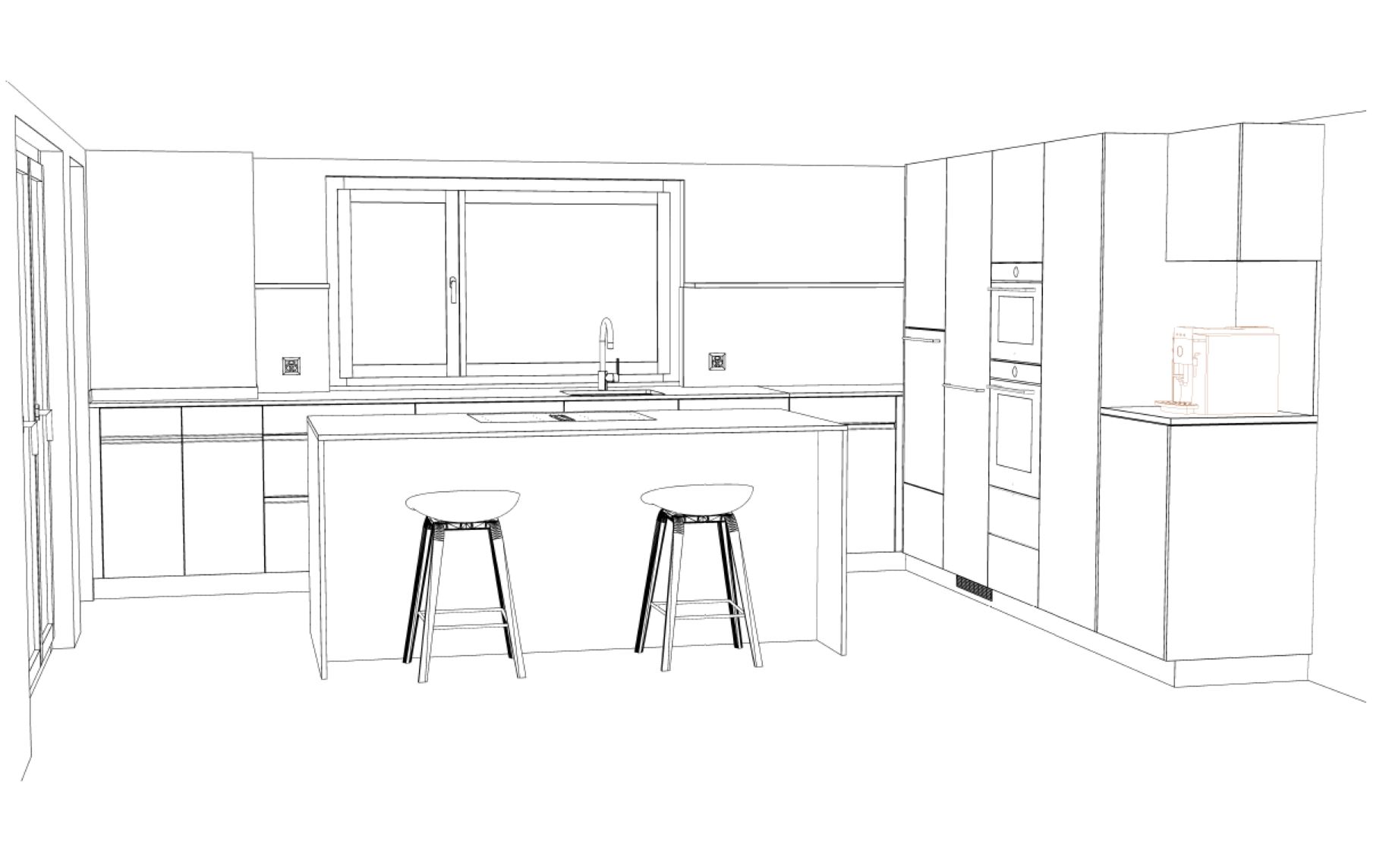 projekttyp massgefertigte wohnk che in einem modernen schweizer einfamilienhaus zeitlose schreinerk che mit kochinsel und deckenhohen einbauschr nken kamera ansicht kritisch f r archsynt frontalansicht auf die k cheninsel kamera auf augenh he mittig vor der insel architektur geometrie fix offene wohnk che mit klarer ruhiger raumstruktur kochinsel mit sitznische im vordergrund deckenhohe hochschrankwand mit integrierten ger ten im hintergrund geometrie ist exakt wie in der vorlage und darf nicht ver ndert werden keine neuen ffnungen keine zus tzlichen w nde keine fenster hinzuf gen keine griffe hinzuf gen oder neu positionieren keine architektonischen erg nzungen oder umdeutungen materialien maintain colors precision fronten supermatt formex farbe twill neutrales warmes weiss wie ral 9010 arbeitsplatte und inselabdeckung aus naturstein granit nero pretoria dunkelgrau bis tiefschwarz feink rnig homogen oberfl che geflammt und geb rstet matt leicht rau samtige haptik mit feiner kristalliner struktur minimal reflektierend edle nat rliche anmutung scharfkantige pr zise geschnittene kanten mit leichter mikrofase massive plattenwirkung hochwertige verarbeitung nat rliches streiflicht betont die oberfl chenstruktur rechts auf arbeitsplatte wie braun gezeichnet eine kaffeemaschine diese jedoch in schwarz mit chromaplikationen darstellen r ckwand material keramik weiss matt ohne fugen ruhig und homogen zwischen arbeitsplatte und oberschrank sowie arbeitsplatte und h lzernem wandtablar so wie links seitliches schmales stehboard auf arbeitsplatte die beiden tablare ber r ckwand in eiche naturfarben schlicht ge lt sitzfl che barhocker weiss und holzuntergestell boden fl chig hellgrau meliert mit feiner struktur seidengl nzend ger te details armatur und sp le edelstahl geschliffen matt k che grifflos mit push to open ausser die beiden gezeichneten griffe rechts bei hochschrank k chenzeile bei fenster mit griffprofil aluminium eloxiert matt zwei backger te v zug schwarzes spiegelglas stark reflektierend backofengriff schwarz matt w nde und decke helles neutrales weiss mineralisch matt fensterrahmen weiss verarbeitung pr zise fugenbilder und ruhige frontaufteilung fl chenb ndige ger teintegration saubere material berg nge keine sichtbaren befestigungen grossz gige fensterfront mit blick ins gr ne nat rliches tageslicht weiche schatten helle freundliche raumwirkung schweizer wohnqualit t atmosph re ruhig hochwertig reduziert schweizer schreinerqualit t zur ckhaltende dekoration einf gen rendering stil fotorealistische architekturvisualisierung maintain colors hohe materialtreue keine berzeichnung kein showroom staging fokus auf geometrie materialauthentizit t und proportionen