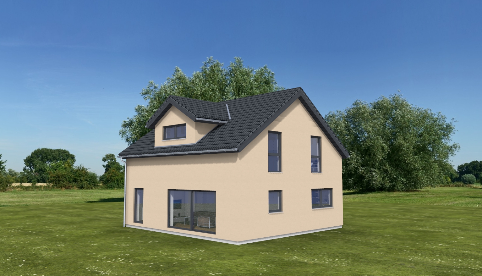 create a highly photorealistic rendering of a single family house based strictly on the provided architectural image the architecture must remain completely unchanged preserve all proportions geometry facade design materials colors window placements and roof shape exactly as given do not reinterpret or redesign any architectural elements the goal is a realistic real world photo look not a stylized render lighting and atmosphere use natural daylight with soft shadows either slightly overcast sky or warm late afternoon light ensure physically correct lighting reflections and shadows avoid exaggerated contrast saturation or dramatic effects materials render all materials with high realism such as plaster wood glass roof tiles and metal include subtle natural imperfections and texture variation keep surfaces clean but not artificial garden and surroundings design the garden like a typical german suburban residential setting include a well maintained lawn restrained planting and realistic layout surround the house with a clearly visible gravel strip spritzschutz approximately 30 cm wide ensure no plants are placed directly against the facade keep a realistic distance vegetation use typical plants such as small shrubs ornamental grasses hedges or boxwood keep planting structured not too dense and not decorative in an artificial way avoid exotic or oversized plants outdoor furniture add subtle and realistic garden furniture that fits a modern single family home for example a simple terrace setup with a wooden or metal table and a few chairs optional a lounge chair or small seating area on the terrace furniture should look natural used but well maintained not staged or overly styled do not overcrowd the scene details add small realistic imperfections for authenticity include elements like a simple pathway driveway or terrace if appropriate keep everything coherent and believable camera and composition use a perspective similar to professional architectural photography eye level or slightly elevated viewpoint natural depth of field sharp details no distortion important constraint do not change the architecture in any way only improve realism lighting materials and environment