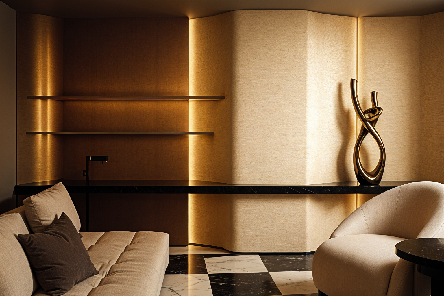 render a modern corporate office space with a sleek minimalistic design use crisp white for the walls to create a calm neutral atmosphere the desks should be a warm natural wood tone white metal legs complemented by sleek black computer monitors and keyboards add ergonomic chairs in a soft gray white color ensuring comfort and style incorporate large potted plants with vibrant green leaves to add a touch of nature install soft diffused lighting to create a warm welcoming ambiance use light grey for the partitions offering privacy while maintaining an open and airy feel glass enclosed meeting rooms have a terracotta feature wall and soft linen sheers cover the external windows overall aim for a balance of professionalism and relaxation with a focus on clean lines and functionality
